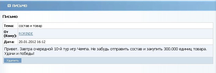 4. Писал ему письма. Просил отправлять состав. Он мне только нахамил в ответ и добавил в игнор-лист. Теперь вице ему пишет. Вице он вообще не отвечает. Наверное тоже добавил в игнор-лист. P.S Заберите у него команду! Я найду нормального менеджера, который будет за ней следить! Команду забрать не имеем права. Предыдущее решение было вынесено 10 дней назад. Для нового решения данных пока мало Сообщение отредактировал Caroline - 21.1.2012, 22:02 -------------------- |