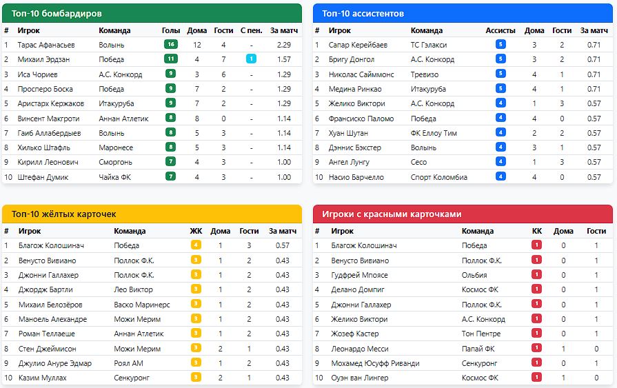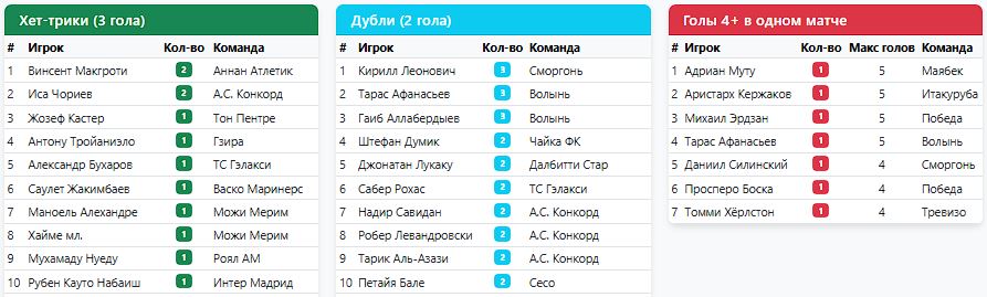 А для души (для себя любимых) в спаренных турах на экваторе (5-6 туры) очень успешно погоняли "оленей" (Мелита). Дважды уверенно по 3:0 (и на выезде, и дома потом). Жозеф Кастер записал на свой счёт 5 из 6 голов. И почти догнал в гонке бомбардиров самого Лукаку) 25 у Джонатана, и 24 теперь в активе Кастера. Правда и ложка дёгтя имеется в его бочонке с мёдом. Слишком часто празднует голы, снимая футболку. И не всем судьям такое по душе. И входит поэтому Жозеф и в анти топ-10, у которых по 4 жк имеется в активе.