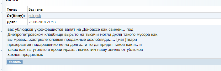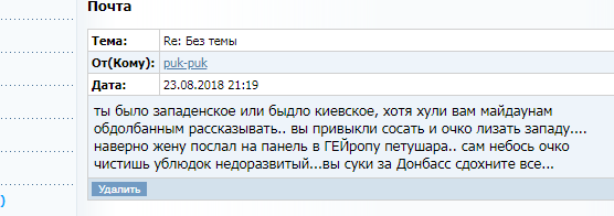Почему-то, вышеупомянутое ничтожество, возомнившее себя "великим русским" (или "великим россиянином" - кому как нравится), позволяет оскорблять честь и достоинство других игроков! Причем, не просто оскорблять - но еще и угрожать!