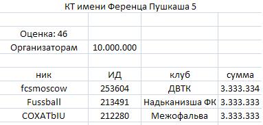 от 75 до 85 (вкл) - 20 млн. гольденов/кол-во организаторов; от 60 до 75 (вкл) - 15 млн. гольденов/кол-во организаторов; от 45 до 60 (вкл) -10 млн. гольденов/кол-во организаторов; до 45(вкл) и без оценки -5 млн. гольденов/ кол-во организаторов. Эти уровни действительны и для старых и для новых турниров? Поясню свой вопрос: в 11 сезоне проводился Suriname Carnival Cup 2. Естественно по старому регламенту (призовые оргам в ПФ не предусмотрены). Заявку на оценивание подали поздно, в результате турнир попал в рейтинг 12 сезона. В 12 сезоне мы провели новый турнир, уже с учетом изменений правил и в ПФ было заложено 8 млн. организаторам. В рейтинге 12 сезона Suriname Carnival Cup 2 получил 57 баллов, а Suriname Carnival Cup 3 - 59 баллов. Правильно ли я понимаю, что за эти турниры организаторы имеют право на вознаграждение 10 млн. (в соответствии с рейтингом) и 8 млн. (согласно регламенту турнира) соответственно? -------------------- Менеджер клуба Бенфика Тсумеб