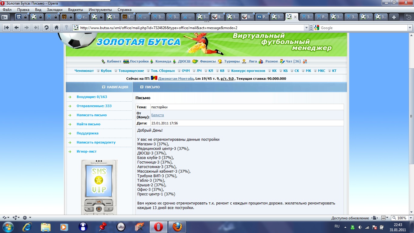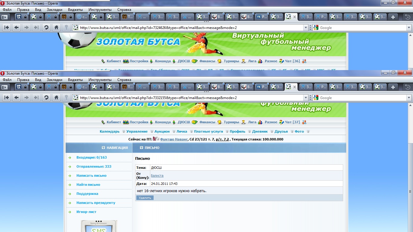 Менеджер Франкт Лодкин (Балиста) http://www.butsa.ru/xml/office/info.php?user=281653 товар - 0 кредит - 39.703.769 вклад - 0 А/С - два подряд ДЮСШ - пуст и не кого не набирает. Тов. матчи не играются. На письма не отвечает после последнего письма не заходит в игру. -------------------- |