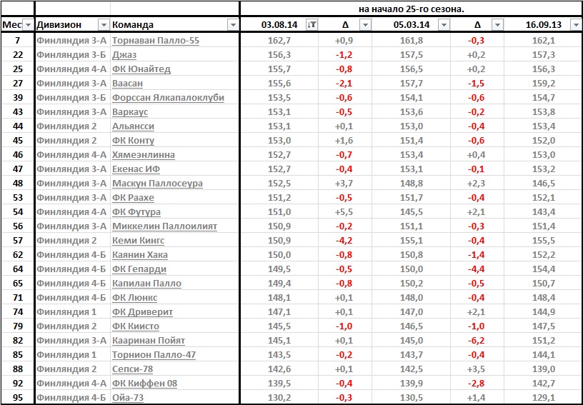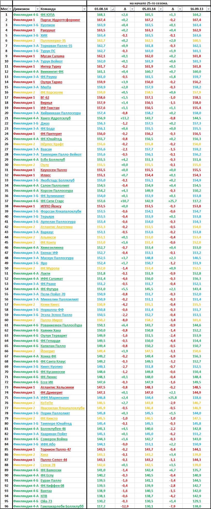 Статистика роста/падения командного мастерства по средней силе 11-ти лучших игроков с 2015.12.06 по 2016.05.08 Общая статистика роста/падения по стране Финляндия.Место...▲▼.......Команда.................Менеджер..................С11 средн....Пред. замер...Прирост ± 1..............ФК ЮПА..................Azure.......................179,40......( 170,61 ).....8,79 2..............Турун Вейкот............WBB.........................170,55......( 168,15 ).....2,40 3.....▲ +2.....Паллокерхо-35...........and18_09....................166,07......( 163,80 ).....2,27 4..............МюПа....................sashab32....................164,55......( 160,31 ).....4,24 5.....▲ +1.....Виикингит ФК............Benderr.....................164,14......( 160,26 ).....3,88 6.....▼ -1.....Паргас Идроттсфорнинг...Dedsan......................164,09......( 165,85 )....-1,76 7.....▼ -1.....Мусан Салама............eskander....................164,06......( 161,98 ).....2,08 8.....▲ +4.....Оулун Тармо.............Кэп 72......................162,95......( 160,98 ).....1,97 9.....▲ +2.....Виркья..................Surveyor....................162,03......( 161,12 ).....0,91 10....▲ +4.....Интер Турку.............funcskamoscow...............162,00......( 157,00 ).....5,00 11....▲ +2.....ФК Санта Клаус..........Naamah......................161,57......( 157,08 ).....4,49 12....▼ -2.....Илвес...................vovan-55....................159,92......( 159,00 ).....0,92 13....▲ +3.....Хийвинкаан Паллосеура...VIP-3 ZeRRega...............159,56......( 160,55 )....-0,99 14....▲ +2.....ФК Зулиманит............Romashishka13...............158,81......( 154,47 ).....4,34 15....▲ +3.....ВГ-62...................nightfly13..................158,46......( 159,38 )....-0,92 16....▲ +4.....Есбо Боллклуб...........Osama.......................157,62......( 150,49 ).....7,13 17....▼ -2.....ИФ Гнистан..............КУЗЬМА_74...................157,51......( 161,82 )....-4,31 18....▲ +2.....ИФК Саламат.............mniam.......................157,39......( 151,22 ).....6,17 19....▲ +4.....Оулу....................yla2003.....................157,18......( 156,24 ).....0,94 20.............Корсон Паллосеура.......istok.......................157,04......( 154,60 ).....2,44 21....▲ +2.....Этэла-Эспоо Палло.......Mikhalych13.................156,80......( 157,30 )....-0,50 22.............ФК Дриверит.............лихчай......................156,41......( 152,35 ).....4,06 23....▼ -2.....ФК Бода.................zaneva......................156,12......( 152,40 ).....3,72 24....▲ +3.....Якобcтадс Боллклуб......nuke89......................156,07......( 154,26 ).....1,81 25....▲ +1.....Салон Паллолият.........ГЃГҐГ§ ìåГåäæåðà ...155,17......( 150,83 ).....4,34 26....▲ +1.....Хонка ФК................chelentano..................155,14......( 149,70 ).....5,44 27....▼ -5.....Яваскилан Ялкапалоклуби.kamigami....................155,09......( 157,86 )....-2,77 28....▲ +4.....КоТеПе..................sbn1977.....................154,99......( 153,39 ).....1,60 29....▼ -3.....ФК Пантерит.............BOROH.......................154,96......( 157,42 )....-2,46 30....▲ +3.....Нёрпес Крафт............Armen.......................154,95......( 153,54 ).....1,41 31.............Спартак Хельсинки.......romlet......................153,98......( 154,22 )....-0,24 32.............ИППО Йенсу..............Stahlhelm...................153,92......( 154,00 )....-0,08 33....▼ -2.....Палло-Сепот-44..........ГЃГҐГ§ ìåГåäæåðà ...153,61......( 159,25 )....-5,64 34....▼ -1.....Оулун Терварит..........albel.......................153,18......( 153,33 )....-0,15 35....▼ -11....Ракуунат................Galmor......................153,12......( 164,75 )....-11,63 36....▲ +2.....Терьярв.................buhenvald1..................152,84......( 153,11 )....-0,27 37....▲ +8.....ИФК Або.................Tabunshchyk.................152,35......( 123,44 ).....28,91 38....▲ +1.....Хака....................judge.......................152,19......( 147,67 ).....4,52 39....▼ -2.....Сомерон Войма...........Bambarbiya..................152,04......( 150,66 ).....1,38 40....▲ +2.....Палло-Иирот.............Roman1983...................149,92......( 152,96 )....-3,04 41....▼ -1.....ФК Муропа...............ГЃГҐГ§ ìåГåäæåðà ...149,67......( 153,21 )....-3,54 42....▲ +2.....Лахти...................vvld1.......................148,09......( 141,68 ).....6,41 43....▼ -2.....Яро.....................Conde.......................148,04......( 147,68 ).....0,36 44.............ФК Сити Старс...........W o W.......................147,74......( 146,12 ).....1,62 45....▼ -2.....Арпелан Паллосеура......Ukrop1......................147,73......( 146,50 ).....1,23 46.............Тампере Юнайтед.........maxim_netafim...............147,62......( 143,56 ).....4,06 47....▼ -2.....Пели-Пойат-70...........winbarca10..................147,17......( 144,99 ).....2,18 48.............Кингс Куопио............ГЃГҐГ§ ìåГåäæåðà ...140,24......( 144,27 )....-4,03 49....▼ -10....ФК Раума................ГЃГҐГ§ ìåГåäæåðà ...139,77......( 158,84 )....-19,07 50....▲ +1.....Каукосен Палло..........drusha......................139,73....