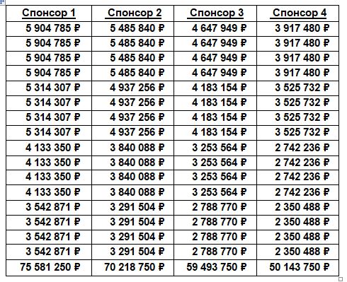 Долго искал, что про них в правилах, но наткнулся толь на то что они есть и относятся ("к доходам, так же, относятся – спонсорские, сумма которых зависит от занятого командой места в предыдущем сезоне"). Как они рассчитываются загадка для меня. Предлагаю свою схему и за основу взять призовые по итогам Чемпионата и Первенств Взять общую сумму всех дивизионов с учётом что 3 и 4 как правило по 2 (3а, 3б, 4а, 4б) Из этих цифр формируем общие спонсорские выплаты (Общ. СВ) на каждый дивизион где, • СВ1 это сумма призовых с 1-го по4-ый дивизионы по позиции • СВ2 это сумма с 1-го по 3-ий дивизионы • СВ3 это сумма 1-го и 2-го дивизионов • СВ4 это сумма 1-го и 4-го дивизионов Сами спонсорские формируются из среднего значения Общ. СВ и делятся на 4 группы по позициям 1-4, 5-8, 9-12 и 13-16, получаем: Понятно, что эти выплаты в идеальном виде и каждый спонсор несёт свои риски в зависимости от дивизиона и позиции клуба, поэтому вычисляем риски по группам в % (с ними можно поиграть): • 1-4 место (4-12%) от спонсора дивизиона • 5-8 место (3-12%) от спонсора дивизиона • 9-12 место (2-8%) от спонсора дивизиона • 13-16 место (1-4%) от спонсора дивизиона Теперь можно привести конечную сумму спонсорских выплат для каждой позиции в дивизионах с учётом рисков: Считаю что с такими выплатами клубы смогут держатся на плаву и заниматься ротацией состава не уходя в сильный минус даже с нынешними ЗП у игрокови держать у себя хотя бы полтора состава сильных игроков Внёс изменения в % и исправил опечатку в одной их формул. Вот что получилось Сообщение отредактировал Denim Demedj - 7.2.2019, 0:12 -------------------- |