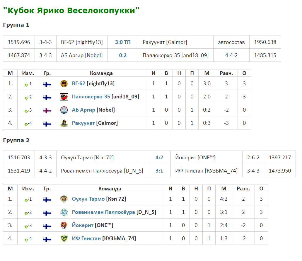 1 группа "АБ Аргир" (Аргир) - "Паллокерхо-35" (Хельсинки) 0:2 Фарерцы (АБ АРГИР) были приглашены на турнир ФС Финляндии для закрытия квоты участников Кубка, т.к. восьмую финскую команду надо было ждать еще неделю. Тут и есть соответствие поговорке – «семеро одного не ждут» (с). В первом же матче островитяне поняли уровень игры команд из Суоми, получив по полной программе домашние 0:2 с определенно долей везения, которая не дала фарерцам огорчить своих зрителей крупным поражением. "ВГ-62" (Наантали) - "Ракуунат" (Лаппенранта) 3:0 (1:3) [ТП] Первый тур, первая группа, первый автосостав. Печально. 2 группа Тут было повеселее. Обе домашние игры хозяева закончили в свою пользу, с разницей в два мяча. "Оулун Тармо" (Оулу) - "Йокерит" (Хельсинки) 4:2 Быстрый гол гостей на 8-й минуте первого тайма позволил им уверенно чувствовать себя весь первый тайм и в перерыве встречи. Что сказал своим игрокам в раздевалке, в перерыве матча тренер «Оулун», остается для нас неизвестным. Однако, во втором тайме, хозяева заметно приободрились и уже к 71 минуте матча, забив 4-й гол в ворота гостей, фактически решили задачу на победу доведя счет до 4:1. Гости огрызнулись на 80 минуте, забив второй гол, но время было упущено. "Рованиемен Паллосёура" (Рованиеми) - "ИФ Гнистан" (Хельсинки) 3:1 А в этом матче хозяева сразу взялись методично расшатывать оборону гостей, не позволяя тем практически ничего. На 8 ударов в створ ворот футболистов из Рованиеми, столичные игроки смогли ответить тремя. К 72 минуте исход игры был понятен. Как и в первом матче этой группы, гости забили на 80-й минуте, слегка подсластив пилюлю первого поражения. Сообщение отредактировал Nobel - 18.4.2021, 9:38 -------------------- ![]() |