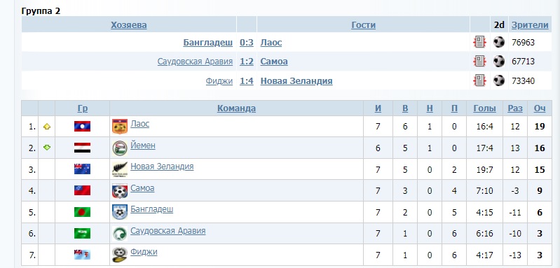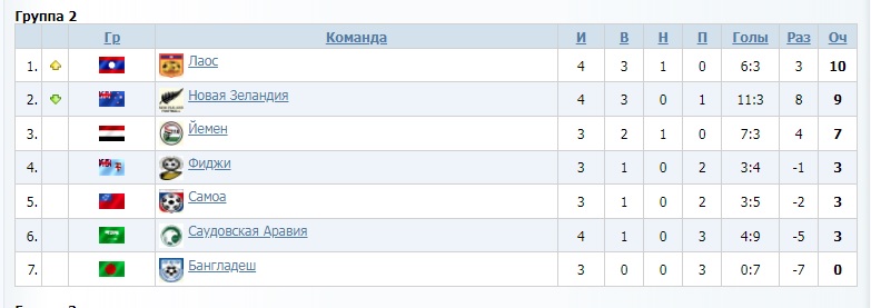выиграли да, но ситуация приняла очень плохой оборот три сборных имеют все шансы на первые два месте, но наша ситация самая плохая Новоая Зеландия выиграла у Йемена и отстает от нас на 1 очко. А нам с ними играть на выезде. плохая комбинация Йемен наверное остальные выиграет, а по потерянным очкам он нас опередит. в общем нам в двух мачтах надо 4 очка., иначе будем в плей офф играть. Х хотя отбор мы провели блестяще -------------------- Давао, Лаос-1. Айлендмэги, Северная Ирландия-1Тренер сборной Лаос клуб принял 20 сентября 2008г. Мои достижения в официальных соревнованиях показать