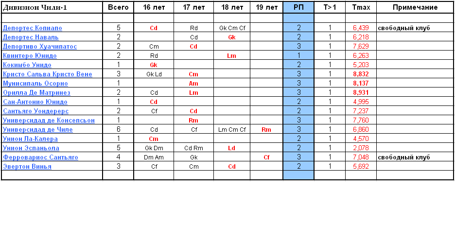 В дивизионе два свободных клуба. Клуб дефенсор Касабланка переименован в Аудакс Итальяно За отчетный период подготовлены и переведены в основу 9 игроков: АК Барнечеа - Cf 18 лет Т9 Универсал Депортес Маипо - Cf 18 лет Т9 Долгожитель Депортес Темуко - Rm 19 лет Т8 Универсал Кобресаль - Cf 19 лет Т9 Выносливый Коло-Коло - Cd 18 лет Т9 Несгибаемый Нубленсе - Cm 17 лет Т9 Скромняга О'Хиггинс - Am 18 лет Т8 Профильный Рейнджерс Талька - Cf 18 лет Т9 Работяга С.Т. Сантьяго - Cm 16 лет Т8 Несгибаемый В ДЮСШ клуба Универсидад Католика готов к переводу Т9. -------------------- |
