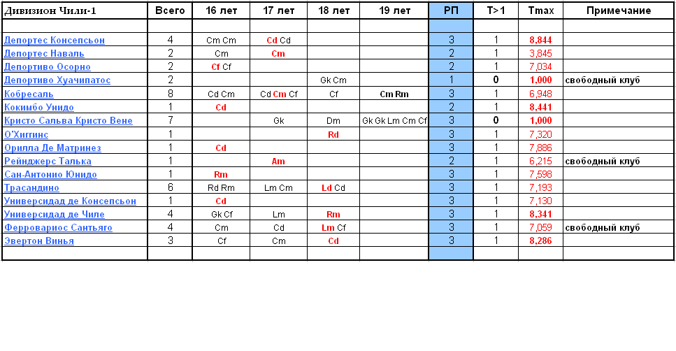 В дивизионе нет свободных клубов. Произведён набор юниоров в ДЮСШ дивизиона, всего набрано 18 игроков. От набора воздержались три клуба. В ДЮСШ дивизиона находятся 9 игроков 19 лет, двое из них тренируют Талант. Печальна ситуация в ДЮСШ клуба Кристо Сальва Кристо Вене, в которой таких игроков пять, а разрешений на перевод пока нет, выходит трое мимо основы и можно отправить в утиль. К тому же, в Кристо Сальва никто не тренирует Талант. С начала сезона в основу переведены три игрока Депортиво Хуачипатос - Cm 17 лет Т8 Долгожитель, Cf 16 лет Т4 Скромняга Универсидад де Чиле - Cd 19 лет Т9 Универсал -------------------- |