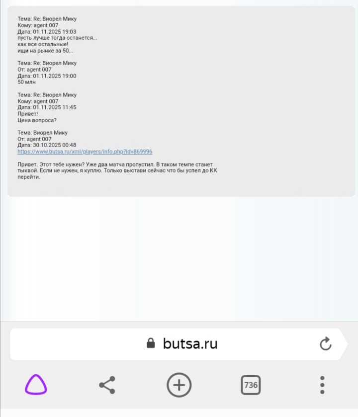 Да, когда покупаешь по завышенной цене, это не значит что он того и стоит. Я понимаю когда борешься за игрока и потом качаешь его по полной, смысл есть. Но это не про тебя. Тема тут о другом, не отходи далеко. А раз начал публиковать личную переписку (за что тоже получишь бан), публикуй и свой последний ответ. Ведь до этого я просил тебя продать другого игрока, тоже Работягу т.4 которого ты превращал в тыкву (любишь ты это дело, качать не всем длано уметь), вот он: Соломон Мамчур, как видим, сидел на ПТ, моя ставка 22 млн (Оками тогда был в моем управлении), думал ну спроста нет, игрок то подпорченный, как вдруг ты мне пишешь, ну что накидывать будешь, или мне снимать?, я даже не успел ответить, как захожу на трансфер а там за короткое время цена выросла под 100 млн. а игрок уже был на аукционе. Созыв группиорвки зашевелился. Там по мимо Динни и Старика приняли участие и другие лица, к ним у меня притензий нет, я вообще добрый человек, просто не люблю махинаторов. Но сейчас как раз время всем помошникам переосмыслить то что когда Сокола начнут топить он потянет и вас за собой. Лучше избавляйтесь по дальше от такого человека и не имейте с ним никаких дел. Вот скрин накрутки для ясности, за пару минут ребята сделали свое дело: ![]() В итоге я игрока всетаки купил, нужен был именно до Клубного Кубка, поставить его на рельсы накачав там опыта и продать перед уходом из команды, чего и произошло. Вернемся к дальнейшей переписки Сокола от его скрина, я ему пишу, так откуда мне знать как цена вырастит? я не экстрасенс., он мне отвечает мол, дурака не вкл. на сколько надо она и вырастит... или ты покупал игрока последнего она сама по себе выросла? Речь шла о Мамчуре. ФП и Админы смогут прочесть переписку ТУТ. Сокол, ты не только сам палишься, но и палишь других менеджеров которые тебе накручивали, хотя повторюсь, у меня к ним претензий нет, но такой ваш шеф, он потопит любого лишь бы выйти сухим из воды. Сообщение отредактировал agent 007 - 18.2.2026, 16:02 -------------------- |