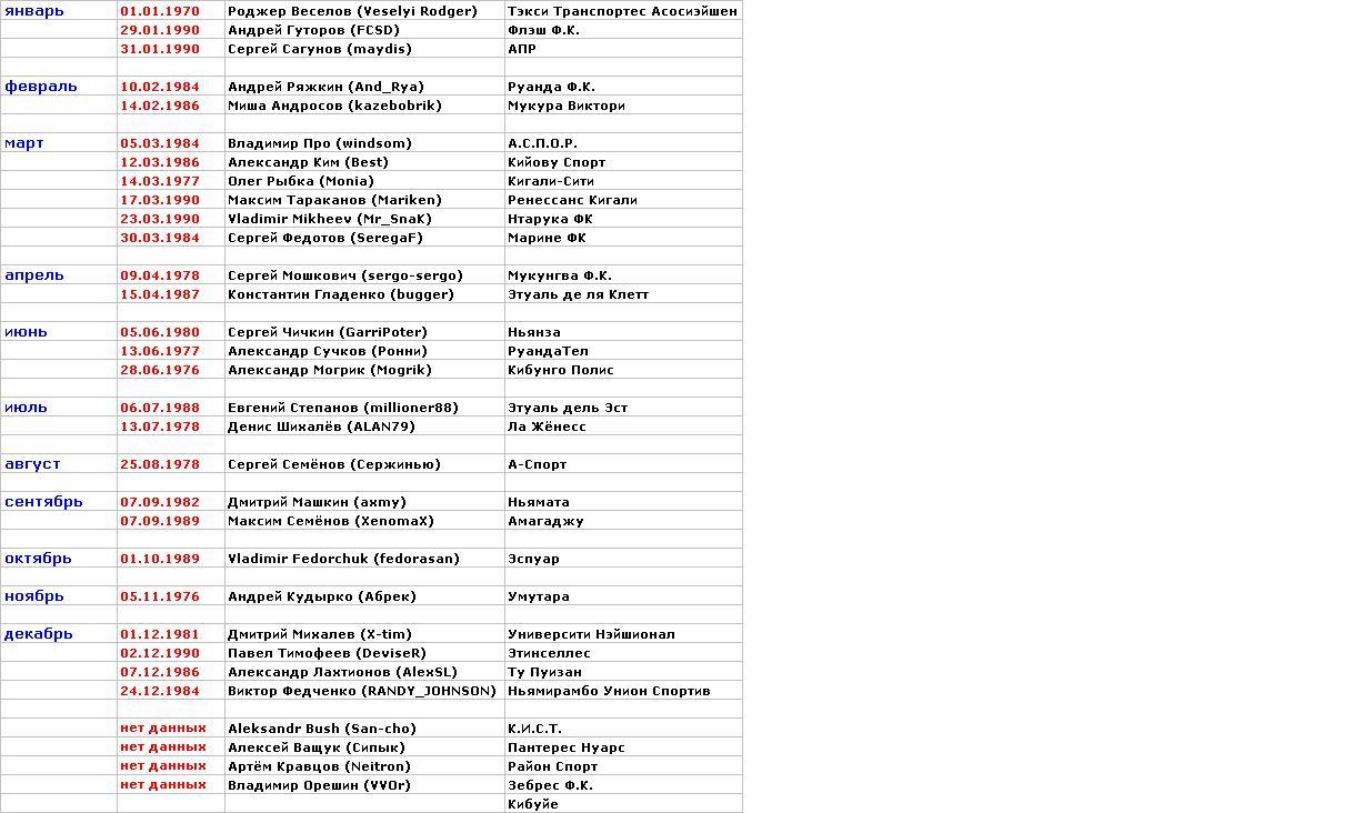 январь 01.01.1970 Роджер Веселов (Veselyi Rodger) Тэкси Транспортес Асосиэйшен 26.01.1975 Александр Карпов (VVS-75) Кибуйе 29.01.1990 Андрей Гуторов (FCSD) 31.01.1990 Сергей Сагунов (maydis) февраль 10.02.1984 Андрей Ряжкин (And_Rya) Руанда Ф.К. 13.02.1986 Евгений Козенок (G_E_K_A) АПР 14.02.1986 Миша Андросов (kazebobrik) март 05.03.1984 Владимир Про (windsom) 12.03.1986 Александр Ким (Best) 14.03.1977 Олег Рыбка (Monia) Кигали-Сити 17.03.1990 Максим Тараканов (Mariken) Ренессанс Кигали 23.03.1990 Vladimir Mikheev (Mr_SnaK) Нтарука ФК 30.03.1984 Сергей Федотов (SeregaF) Мукура Виктори апрель 09.04.1978 Сергей Мошкович (sergo-sergo) 13.04.1984 Евгений Матвиевский (Jenek_continent) Мукунгва Ф.К. 15.04.1987 Константин Гладенко (bugger) май 13.05.1977 aleksandr korolenko (moro1) Ту Пуизан 14.05.1983 Aleksandr Bush (San-cho) К.И.С.Т. июнь 05.06.1980 Сергей Чичкин (GarriPoter) 13.06.1977 Александр Сучков (Ронни) 28.06.1966 Александр Могрик (Mogrik) Кибунго Полис июль 06.07.1988 Евгений Степанов (millioner88) Этуаль дель Эст 07.07.1987 Сергей Коношенок (Nando_87) А.С.П.О.Р. 13.07.1978 Денис Шихалёв (ALAN79) Ла Жёнесс 27.07.1983 Анатолий Трунов (Gonza-JUVE) Район Спорт август 16.08.1972 Владимир Орешин (VVOr) Зебрес ФК 25.08.1978 Сергей Семёнов (Сержинью) сентябрь 07.09.1982 Дмитрий Машкин (axmy) 07.09.1989 Максим Семёнов (XenomaX) Амагаджу 29.09.1986 Сергей Фризюк (russkiisergei) Этуаль де ля Клетт октябрь 01.10.1989 Vladimir Fedorchuk (fedorasan) 14.10.1990 Алексей Ващук (Сипык) ноябрь 05.11.1976 Андрей Кудырко (Абрек) Умутара 25.11.1984 Александр Игнатов (Chpok) Пантерес Нуарс декабрь 01.12.1981 Дмитрий Михалев (X-tim) Университи Нэйшионал 02.12.1990 Павел Тимофеев (DeviseR) 07.12.1986 Александр Лахтионов (AlexSL) 24.12.1984 Виктор Федченко (RANDY_JOHNSON) Ньямирамбо Унион Спортив ![]() Сообщение отредактировал And_Rya - 23.1.2015, 18:24 -------------------- показать