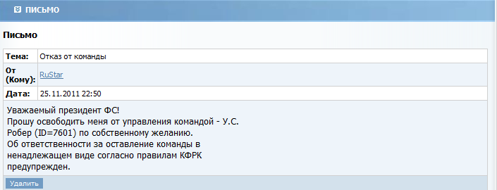1) Когда подавалась заявка на освобождение команды? Заявка подана на освобождение 25.11.11 в 22:50. Об этом свидетельствует скриншот. Президент заявку подал 26-го. То, что заявка не была принята сразу проблема ваша. Фактом получения команды является 27-е число - это конец сезона по-любому. Прошу заметить, что в правилах об этом ничего нет - ни времени, ни воскресенья. Это нет, это Ваша проблема. Вы отказались от команды ДО 84 ИД и заявка была подана ДО 84 ИД. Вам могло повезти, если бы Лукас обработал заявку на 40 минут позже. Но не повезло. Я бы ещё пошёл навстречу, если бы всё действительно было как Вы говорили - отказались от команды после Генерации, но Вы сделали это ДО, поэтому тут всё очевидно. 2) Чтобы тогда писал RuStar? RuStar тогда не стал бы ничего писать, если бы все было сделано по правилам. Виноват - получи наказание, а если нет, то исправляйте свой скрипт. Ошибка в коде... По идее закончился 84 ИД в 23:59:59 - сработал скрипт. Зачем ждать до 2:00? См. выше. Вы отказались от команды до окончания 84 ИД. Тут говорить не о чем. Почему в 2 ночи? По тому, что в это время запускается скрипт "everyday", выполняющий ежедневно все необходимые действия. 3) С чем связана поспешность освобождения команды? Да не было никакой поспешности. Почему-то я подумал, что не освободят ее 26-го и я вполне доиграю последнюю тову. То что ее не освободили - это ваш косяк и правда нечего перекладывать с больной головы на здоровую. На каком основании Вы думали, что вашу заявку будут 2 дня мусолить? У нас здесь, слава Богу, люди на совесть работают, оперативно. Вопрос с Гранд-Гоав еще пока открыт - кредит в 27.6 млн. пока еще весит. Уплаченные проценты вернуть не забудьте. Азур снимет кредит. Про % не знаю. С Декорой вопрос тоже считаю не закрытым. Думаю это на вашей совести. Решать вам. Я никого "пугать" и шантажировать не собираюсь. Но в случае, если на встречу мне не пойдете, то указанные условия в первом моем посте будут исполнены. Я уже объяснил, почему считаю, что всё сделано в рамках правил. -------------------- |