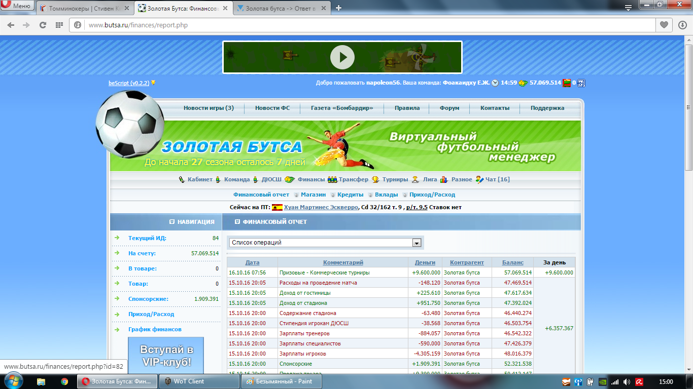Оценку турниру не поставил! Да мне тоже подсказали, вот выдержка из правил: 3.14. Менеджеры не выставившие оценку за турнир, получают 80% от полагающихся призовых. Исключение делается для организатора турнира, который не может выставить оценку, и поэтому всегда получает полагающиеся призовые полностью. -------------------- Президент ФС Мальдив и Пакистана