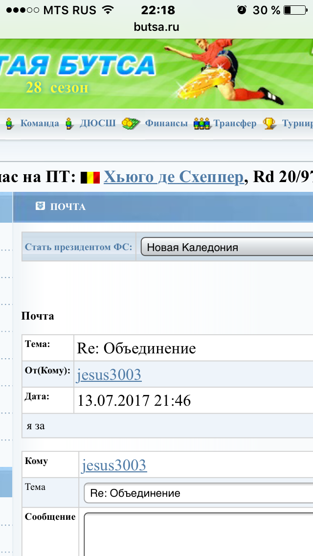 Всем привет! Пришел сюда по рассылке ARTICO. Менеджер клуба Новой Каледонии "АС Куни" на протяжении 16 сезонов. http://www.butsa.ru/roster/ku8/ Не имею ничего против объединения наших ФС. Главное, название клуба чтобы не менялось.