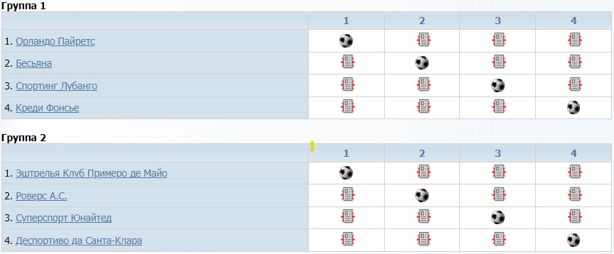 Орландо Пайретс 2:0 Спортинг Лубанго (23.094) Бесьяна 4:0 Креди Фонсье (24.022) Деспортиво да Санта-Клара 0:0 Эштрелья Клуб Примеро де Майо (23.707) Роверс А.С. 3:0 Суперспорт Юнайтед (33.049) -------------------- Фламингос - Ангола