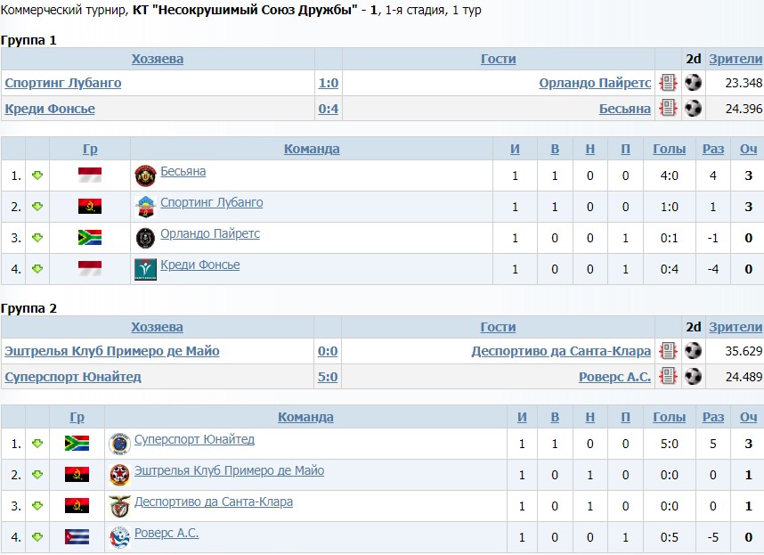 Суперспорт Юнайтед 2:1 Бесьяна (23.788) Орландо Пайретс 0:3 Роверс А.С. (23.421) -------------------- Фламингос - Ангола