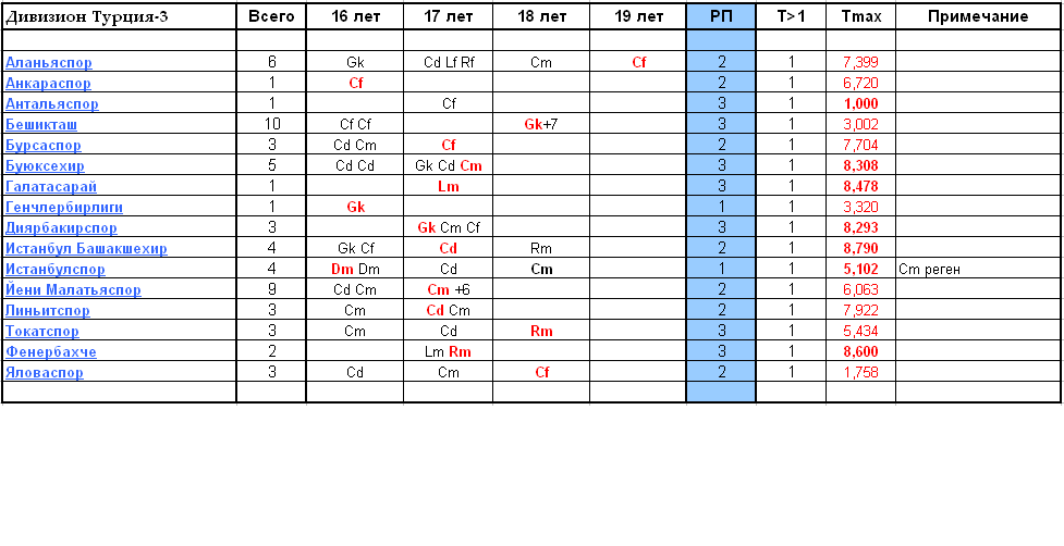 В дивизионе нет свободных команд. За отчётный период, подготовлены и переведены в основу следующие игроки: Аланьяспор - Cf 19 лет Т8 Работяга Буюксехир - Cm 17 лет Т9 Несгибаемый Галатасарай - Lm 17 лет Т9 Профильный Генчлербирлиги - Gk 16 лет Т7 Выносливый Диярбакирспор - Gk 17 лет Т9 Умелец Истанбул Башакшехир - Cd 17 лет Т9 Профильный Линьитспор - Cd 17 лет Т9 Выносливый Фенербахче - Rm 17 лет Т9 Скромняга Игроков 19 лет в ДЮСШ дивизиона нет. В ДЮСШ клуба Бешикташ есть лишние игроки. В наличии 8 игроков 18 лет. Клуб имеет три разрешения(РП), два РП добавятся в следующем сезоне. Максимум, 5 игроков на перевод. В ДЮСШ клуба Йени Малатьяспор может сложиться схожая ситуация, если вовремя не принять меры. В ДЮСШ 7 игроков 17 лет. -------------------- |