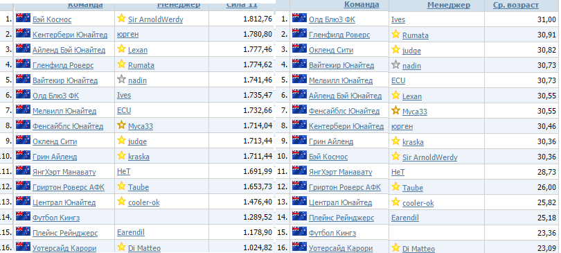 Нашу самую сильную по цифрам команду - Бей Космос возглавил опытный менеджер, Sir ArnoldWerdy. У него 7 летний опыт управления командами и 15 кубков и медалей в различных первенствах. Поприветствуем его и пожелаем ему успехов! Согласно предварительным оценкам у нас есть 4 заведомо слабые команды, остальные по силе находятся в очень плотной группе. Все решат стратегии на длинной дистанции и управление физической готовностью игроков. Нас ждут острые тактические соперничества. Приглашаю всех иногда заходить в данный топик, почитать и обсудить текущий чемпионат! Принимаются любые пожелания и предложения! 1 тур 2 тур 3 тур 4 тур 5 тур "ФС Новой Зеландии: прошлое и настоящее" Выпуск 1 6 тур 7 тур "ФС Новой Зеландии: прошлое и настоящее" Выпуск 2 Менеджер года: Менеджер Кентербери Юнайтед - юрген - 3 Менеджер Вайтекир Юнайтед - nadin - 1 Менеджер Мелвилл Юнайтед - ECU - 1 Менеджер Грин Айленд - kraska - 1 Менеджер Фенсайблс Юнайтед - Муса33 - 1 Сообщение отредактировал Het - 21.4.2017, 20:22 -------------------- Менеджер команды ЯнгХэрт Манавату (Новая Зеландия-2)