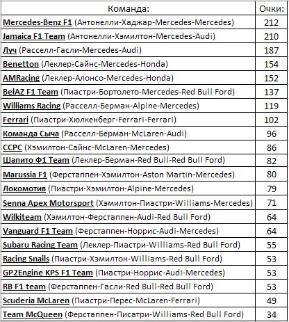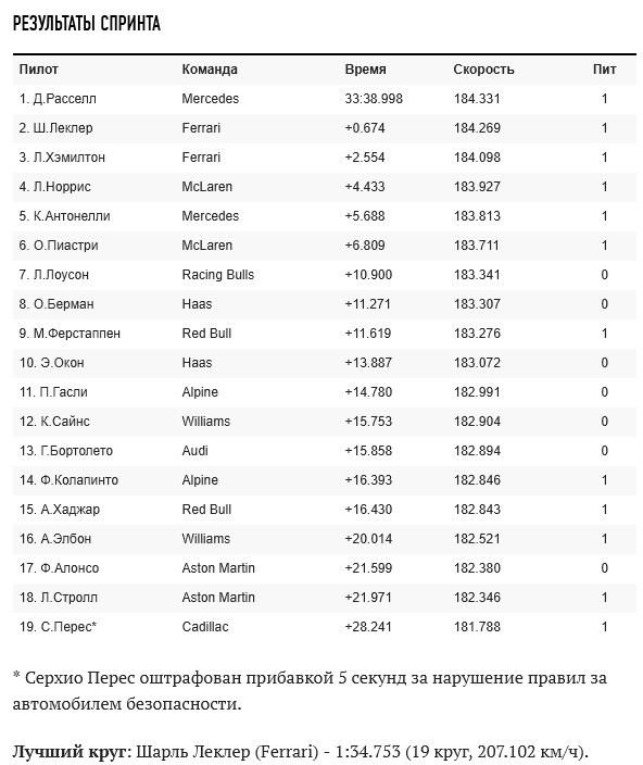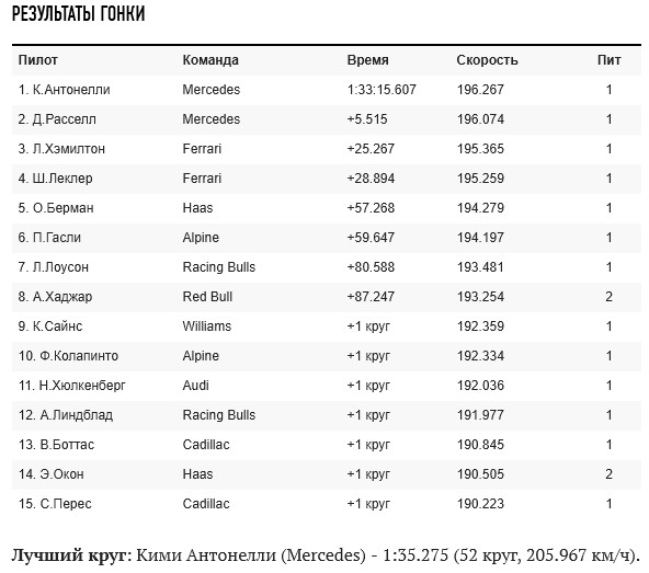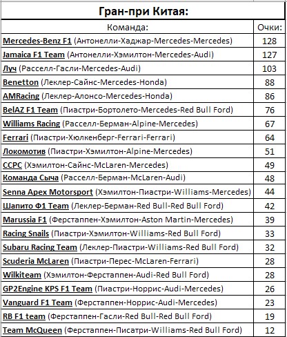![]() Гонщики: 1. Расселл: 8 + 3 (победа в спринт-квалификации) = 11 2. Леклер: 7 + 1 (быстрейший круг в спринте) = 8 3. Хэмилтон: 6 4. Норрис: 5 5. Антонелли: 4 6. Пиастри: 3 7. Лоусон: 2 8. Берман: 1 Шасси: Mercedes: 15 Ferrari: 14 McLaren: 8 Racing Bulls: 2 Haas: 1 Моторы: Mercedes: 11 + 5 + 4 + 3 = 23/4 = 6 Ferrari: 8 + 6 + 1 = 15/3 = 5 Red Bull Ford: 2 ![]() Гонщики: 1. Антонелли: 25 + 5 (победа в квалификации) + 3 (быстрейший круг в гонке) + 3 (гонщик дня) = 36 2. Расселл: 18 3. Хэмилтон: 15 4. Леклер: 12 5. Берман: 10 6. Гасли: 8 7. Лоусон: 6 8. Хаджар: 4 9. Сайнс: 2 10. Колапинто: 1 Шасси: Mercedes: 51 Ferrari: 27 + 3 (лучший пит-стоп) = 30 Haas: 10 Alpine: 9 Racing Bulls: 6 Red Bull: 4 Williams: 2 Моторы: Mercedes: 33 + 18 + 8 + 2 + 1 = 62/5 = 12 Ferrari: 15 + 12 + 10 = 37/3 = 12 Red Bull Ford: 6 + 4 = 10/2 = 5 Тур №2: ![]() Положение команд: