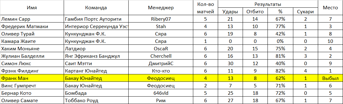 Будем вести статистику вратарей (только в матчах чемпионата). Для того, чтобы принять участие в конкурсе, необходимо оставить заявку. Определяться победитель будет по проценту отбитых мячей. Участник должен провести не менее 15 матчей за свой клуб в чемпионате. Правила подсчета: Процент отраженных ударов. К примеру : За сезон было нанесено в створ 123 удара. А пропустил ваш вратарь 23 мяча. Т.е отбил 100 мячей из 123 - х нанесенных. Таким образом 100 делим на 123 и умножаем на 100, получаем процент отраженных ударов равный - 81,3008. Победит тот, у кого он будет больше Заявку отправлять в следующем в виде: Сенгор Вудс Каиро Сило (или имя фамилия клуб и обязательно ссылку на вратаря) Предварительные отчёты постараюсь делать каждые 5 туров. Итог будет подведён по достижению каждого участника 15-и матчей, в случае, если вратарь не сыграет нужное количество матчей по каким-либо причинам, он дисквалифицируется. Призовой фонд конкурса - 15 000 000 гольденов. 1 место: 7 000 000 гольденов. 2 место: 5 000 000 гольденов 3 место: 3 000 000 гольденов 49-й сезон! Участники: 1. Лемин Сарр - Гамбия Портс Ауторити 2. Фредерик Матмаки - Интериор Серрекунда Уэст 3. Оливер Турай - Кункунджан Ф.К. Выбыл 3. Камара Жаите - Кункунджан Ф.К. 4. Хаким Моньяне - Латдиор 5. Жулиан Балделли - Янг Эфриканз Банджул 6. Симон Люкс - Саит Мэтти Ф.К. 7. Фрэнк Филдинг - Картанг Юнайтед 8. Франк Ман - Бакау Юнайтед Выбыл 9. Винс Гумпречт - Бакау Юнайтед Выбыл 10. Бернар Кото - Бомбада 11. Оливер Самате - Тоббако Роуд Сообщение отредактировал ТОРВАЛЬД - 15.4.2026, 10:44 |