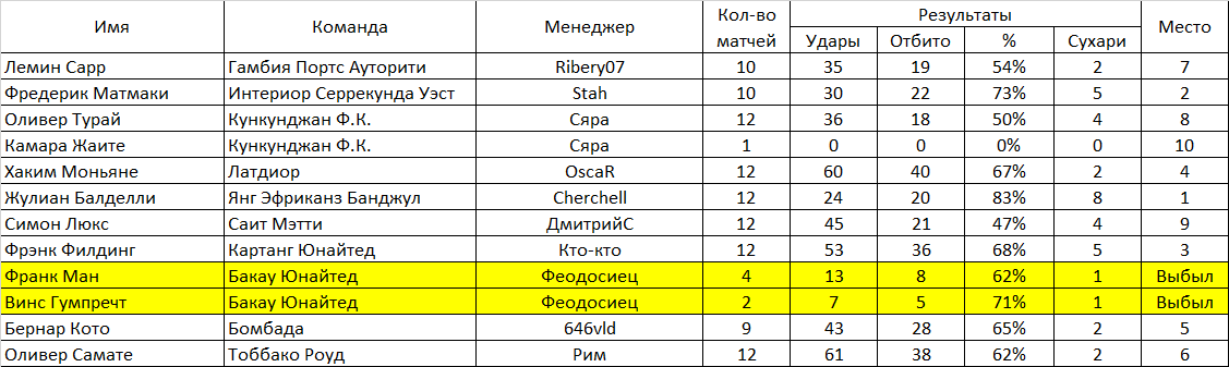 Будем вести статистику вратарей (только в матчах чемпионата). Для того, чтобы принять участие в конкурсе, необходимо оставить заявку. Определяться победитель будет по проценту отбитых мячей. Участник должен провести не менее 15 матчей за свой клуб в чемпионате. Правила подсчета: Процент отраженных ударов. К примеру : За сезон было нанесено в створ 123 удара. А пропустил ваш вратарь 23 мяча. Т.е отбил 100 мячей из 123 - х нанесенных. Таким образом 100 делим на 123 и умножаем на 100, получаем процент отраженных ударов равный - 81,3008. Победит тот, у кого он будет больше Заявку отправлять в следующем в виде: Сенгор Вудс Каиро Сило (или имя фамилия клуб и обязательно ссылку на вратаря) Предварительные отчёты постараюсь делать каждые 5 туров. Итог будет подведён по достижению каждого участника 15-и матчей, в случае, если вратарь не сыграет нужное количество матчей по каким-либо причинам, он дисквалифицируется. Призовой фонд конкурса - 15 000 000 гольденов. 1 место: 7 000 000 гольденов. 2 место: 5 000 000 гольденов 3 место: 3 000 000 гольденов 49-й сезон! Участники: 1. Лемин Сарр - Гамбия Портс Ауторити 2. Фредерик Матмаки - Интериор Серрекунда Уэст 3. Оливер Турай - Кункунджан Ф.К. Выбыл 3. Камара Жаите - Кункунджан Ф.К. 4. Хаким Моньяне - Латдиор 5. Жулиан Балделли - Янг Эфриканз Банджул 6. Симон Люкс - Саит Мэтти Ф.К. 7. Фрэнк Филдинг - Картанг Юнайтед 8. Франк Ман - Бакау Юнайтед Выбыл 9. Винс Гумпречт - Бакау Юнайтед Выбыл 10. Бернар Кото - Бомбада 11. Оливер Самате - Тоббако Роуд Сообщение отредактировал ТОРВАЛЬД - 15.4.2026, 10:44 |