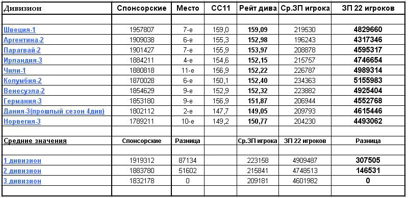 Андрей, я потому и написал про неправомерность перевода нашего диалога в сферу понятий, что начинается разночтение одних и тех же слов. Понятие "нормальная (равно как и плавная) кривая" не осязаемо. Можно до посинения спорить какая кривая является нормальной, а какая нет, но так и не договориться. Доказательная база это цифры, в крайнем случае, логика, а не эпитеты. Увы. В систему призовых за более высокий дивизион входит более высокий зрительский рейтинг, более высокие спонсорские, более высокие выплаты по итогам сезона. Не знаю, возможно, еще что-то забыл. Но это совершенно неважно. Важно, что называть систему призовых "пилообразной" и призывать сделать её "нормальной кривой" нельзя: даже всего три разносторонних фактора не позволяют вычислить эту нормальную кривую. Нет её в природе. И добавление ещё одного фактора никак проблему не решит. Да и есть ли проблема? Прости, но ты меня не убедил в её существовании. Хорошо. Возражения резонные, давай с цифрами. Цитата К доходам, так же, относятся – спонсорские, сумма которых зависит от занятого командой места в предыдущем сезоне. Вот я тут табличку наваял. Сделал выборку из своих клубов. Взял 10 клубов, выкинул эквадорский, там всего два дивизиона. В таблице отражены данные по спонсорским каждой команды. Рассчитана средняя зарплата игрока и определена сумма расходов на ЗП игроков из расчета 22 игрока в команде. Далее, посчитаны средние значения по статусу дивизиона. Команды распределены по убыванию спонсорских. Что видим. Самые высокие спонсорские в Швеции-1. Самые низкие в Норвегии-3. Между ними разница 168596. Спонсорские могут быть выше в третьем дивизионе, чем в первом. Смотрим Ирландия-3 и Чили-1. Делаем вывод. Размер спонсорских не зависит от статуса дивизиона. Перейдем к средним значениям Здесь картина более красивая. Спонсорские выше в 1-х дивах, далее следуют 2-е дивы и последние 3-е дивы. Смотрим разницу. В ИД 1-й див получает на 35,5тыс. больше чем 2-й и на 87тыс больше чем 3-й. Расходы по зарплате в ИД в 1-х дивах на 161тыс больше чем во 2-х и на 307,5тыс больше чем в третьих. Делаем вывод. Преимущество в объеме спонсорских более высокого дивизиона покрывает примерно 25-35% расходов по зарплате. Теперь посмотрим что такое Зрительский рейтинг. Цитата Зрительский рейтинг влияет на посещаемость матче и зависит от (15 - гарантированный минимум, максимум 100): 1. До 20 - отчеты пресс-конференций чемпионата (10 последних, за каждую 2 балла); 2. До 10 - пресс-атташе; 3. До 25 - рейтинг дивизиона по силе 11; 4. До 15 - разница между местом по силе 11 в дивизионе и местом в таблице чемпионата (разница умножается на 3, но не более 15, при отрицательной - 0); 5. До 15 - место в таблице чемпионата (одно место – 1 балл, первое место 15, последнее – 0, т.е. N=16-m); 6. 15 - гарантированный минимум. Пункты 1,2,5,6 не зависят от статуса дивизиона. Это 60 баллов рейтинга. Осталось 40 баллов на два показателя. И вот здесь самое интересное. п3. Рейтинг дивизиона по силе 11 до 25 баллов. Что такое рейтинг дивизиона? Я так понимаю средняя сила 11 всех команд дивизиона. Так вот например в Парагвае и Чили: Парагвай-1=152,03 Парагвай-2=153,87 Чили-1=152,22 Чили-2=152,71 Делаем вывод. Статус дивизиона не влияет на рейтинг силы дивизиона. Почему? Потому, что в Парагвае-1 две команды пошли на слив, в Чили-1 одна. А если бы таких команд было четыре? Получается, команды идущие на слив занижают зрительский рейтинг о