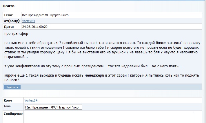 После блокировки игрока на трансфере получил неприятное письмо от менеджера. парень играет с 2007 года и превратил команду в хлам других слов у меня нет, а тут решил ещё продать последнего таланта Т7 собственно больше у него талантов и не осталось.