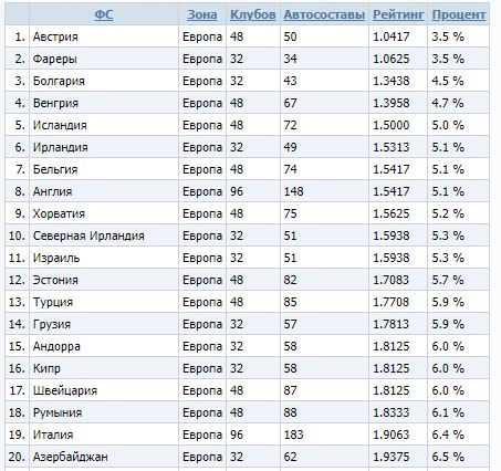 - 16-17 -ое место общее 6,6% по автосоставам; - в ФС состоящих только из 48 клубов - 6-7 -ое место! - 95 автосоставов всего; Австрия в мире из 137 ФС: - 49-50 -ое место по а/с; - в ФС состоящих только из 48 клубов - 10-11 -тое место! - 95 автосоставов всего... Результаты чуть по-хуже, но это лето, спишем всё на него. Всем здоровья и удачи!