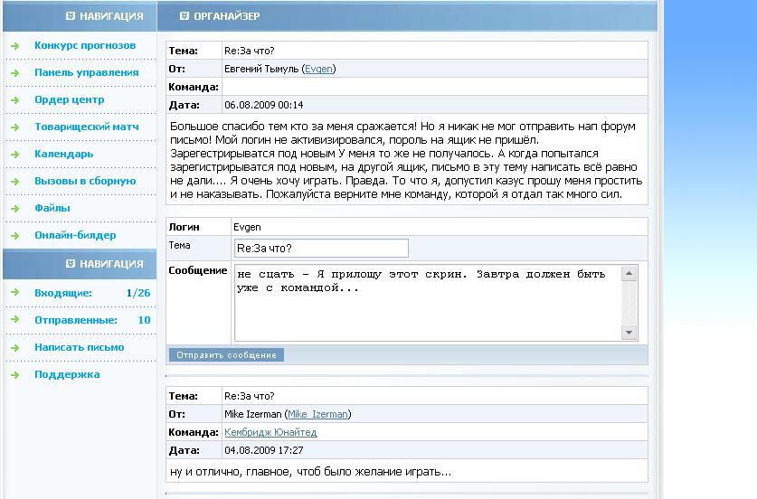 На контакт пока не выходит. Да и немудрено - таким нехорошим способом (опущу все другие эпитеты) послать его в далёкие дали... (выдав КК) А зная, как обстоят дела, я и не удивлюсь, что больше его и не увижу на сайте больше... вот скрин письма - поэтому в очередной раз хочется спросить - куда так было спешить? А какой смысл возвращать команду менеджеру, если: 1) менеджер сам признал, что не имел достаточного времени управлять командой; по логам видно, что и раньше он заходил на сайт раз в несколько дней; 2) менеджер в течение 15 дней вообще не появлялся в проекте 3) сам президент не уверен, появится ли он еще тут. Выдать команду, чтобы через несколько дней скрипт заново выставил ее? Если нет уверенности, что менеджер не заинтересован в управлении командой, возврата не будет. П.С. Просьба на форуме ФП соблюдать правила поведения и не обсуждать правила проекта. Администрация и так пошла навстречу вашим просьбам, так не надо наглеть, пожалуйста. Сообщение отредактировал Caroline - 4.8.2009, 16:37 -------------------- |