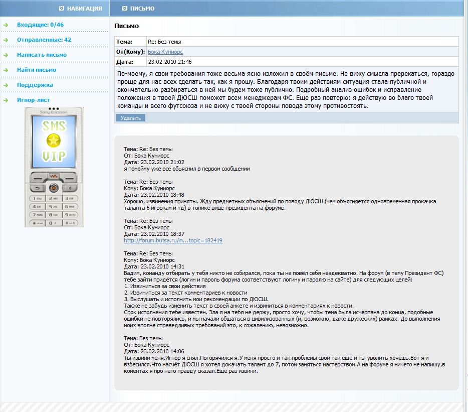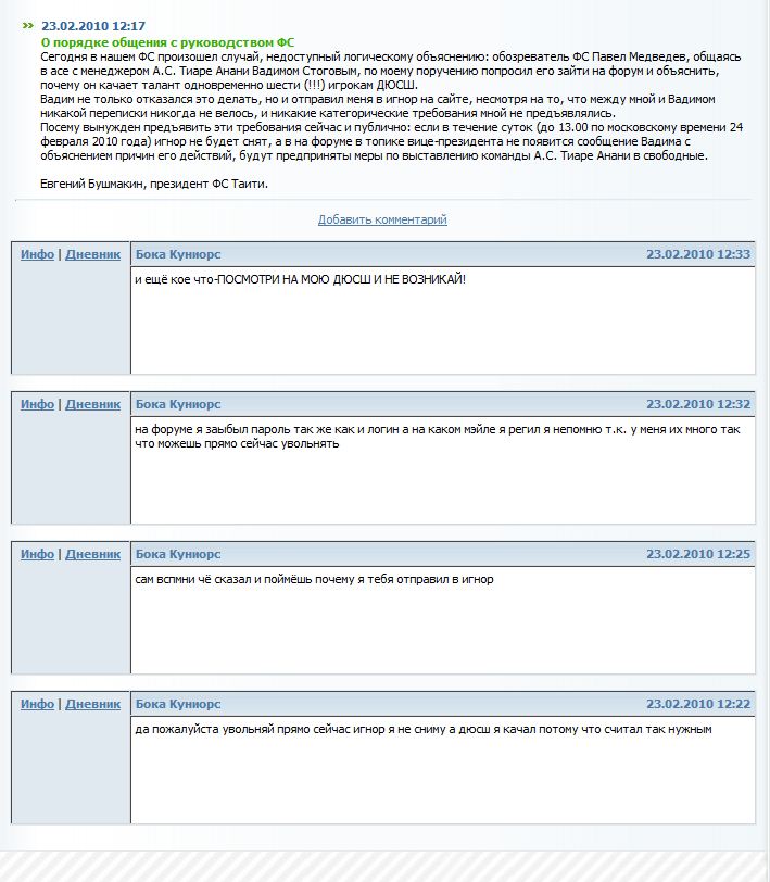 Собственно вся эта загадочная история описана в скриншотах. Хронологически скриншот с новостью первый, с перепиской - второй. Менеджер принес извинения на форуме - http://forum.butsa.ru/index.php?showtopic=182419 А кто интересно вам разрешил переписку выкладывать в паблик? )) Я бы вам предупреждение для начала выдал раз уж вы о правилах Однако, моей целью как президента ФС было не выслушивание хамства и последующих извинений, а предотвращение развала команды. Тем не менее, мои возможности в этом плане исчерпаны. Я не прошу именно отъема команды у менеджера, а просто полагаюсь на помощь ФП в спасении команды. Любое решение меня устроит. профиль менеджера - http://butsa.ru/users/304080 можно не флудить хотя бы в чужих темах? переписка выложена в рамках выполнения мной обязанностей президента. -------------------- А.С. Ваиотаха (Таити-1)