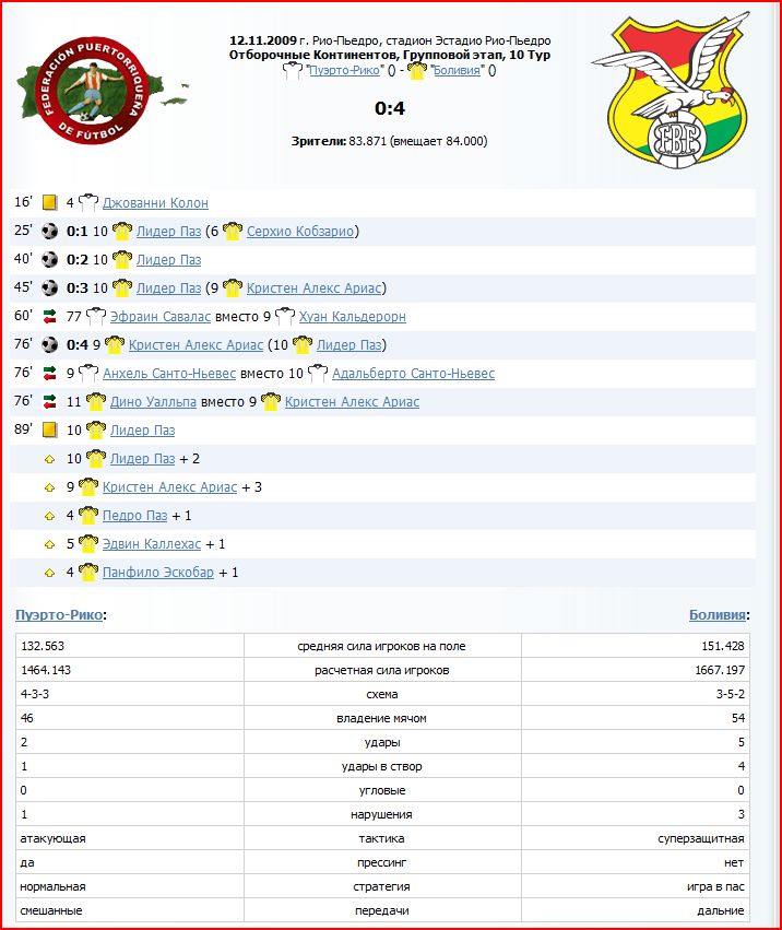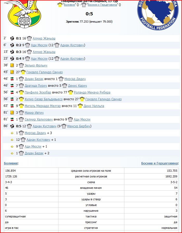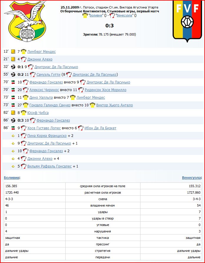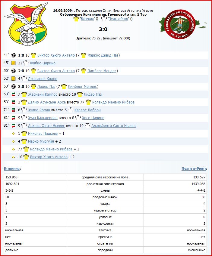 16.07.2009 Сьерра Леоне 0:0 Боливия Товарищеские матчи сборных, 16 тур 12.05.2009 Оман 0:0 Боливия Товарищеские матчи сборных, 15 тур 09.05.2009 Сьерра Леоне 0:1 Боливия Товарищеские матчи сборных, 14 тур 07.05.2009 Боливия 3:2 Сьерра Леоне Товарищеские матчи сборных, 13 тур 06.05.2009 Доминика 1:0 Боливия Товарищеские матчи сборных, 12 тур 05.05.2009 Боливия 2:2 Доминика Товарищеские матчи сборных, 11 тур 02.05.2009 Боливия 5:1 Тонга Товарищеские матчи сборных, 10 тур 30.04.2009 Тонга 1:0 Боливия Товарищеские матчи сборных, 9 тур 29.04.2009 Боливия 0:0 Эфиопия Товарищеские матчи сборных, 8 тур 28.04.2009 Боливия 3:2 Антигуа и Барбуда Товарищеские матчи сборных, 7 тур 25.04.2009 Экваториальная Гвинея 2:0 Боливия Товарищеские матчи сборных, 6 тур 23.04.2009 Непал 2:0 Боливия Товарищеские матчи сборных, 5 тур 22.04.2009 Боливия 1:2 Непал Товарищеские матчи сборных, 4 тур 21.04.2009 Антигуа и Барбуда 1:1 Боливия Товарищеские матчи сборных, 3 тур 18.04.2009 Боливия 2:0 Экваториальная Гвинея Товарищеские матчи сборных, 2 тур 09.04.2009 Эфиопия 1:2 Боливия Товарищеские матчи сборных, 1 тур Добавлено 20th March 2010 - 10:59 Странно, но резы 11-го сезона не могу найти. Сообщение отредактировал playmaker - 20.3.2010, 11:56 -------------------- Куплю товар.