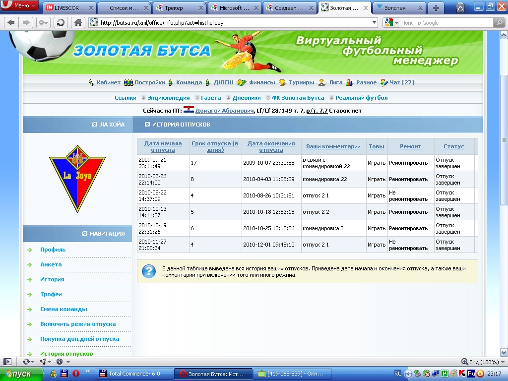 У меня возникла такая проблема. Меня в который раз обвиняют в мультиводстве, хотя я этим не занимаюсь. При проверке трансфера ( http://butsa.ru/players/9477 ) возникло подозрение. Трансфер отменили. Президент ФС объяснил, что мне шли заходы с компа другого пользователя. Все дело в том, что я играю вместе со своей девушкой, машины у нас разные, но иногда я захожу с ее компьютера (мы живем в разных городах, когда я нахожусь у нее в гостях, предпочитаю не бегать в компьютерный клуб). Перед этим обязательно предварительно со своего компа включаю режим отпуска. Так и в этот раз, режим отпуска был включен, дни отпуска списаны, по возвращению за свой комп РО отключил. Эта история имеет свойство повторяться, когда-то я уже имел аналогичные проблемы, но до отмены трансферов не доходило. Буду признателен за ответ, который подскажет, как избежать подобного в будущем. Заранее спасибо. п.с. В прикрепленных файлах история отпусков и количество оставшихся дней. |