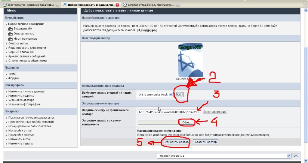 3)Аватар можно поставить 3-мя способами: выбрать из галереи цифра 2 на рисунке, ввести ссылку на ваш аватар цифра 3 , и вставить аватар со своего компьютера, цифра 4, далее просто нажимаем внизу обновит (цифра 5) Сообщение отредактировал Serega1988 - 11.1.2010, 15:35 -------------------- |