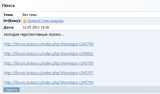 Менеджеры фс систематически получают в личную почту рекламу игроков продаваемых этим тренером!! Это многих менеджеров раздражает.Став президентом,я обязан обеспечить им комфортную игру в турецком футсоюзе. Так как письма в личке через 3 месяца удаляются есть только эти. в личку оказалось мало,и мы переехали на форум(данные игроков стёрты мной по понятным причинам) Потом последовал очередной спам,на который уже отреагировал наш вице.реклама осталась в ответе вице,свою он удалил Наконец-то,прочитав правила проекта,реклама была опубликована в положенном для этого месте.Но руки зачесались,и ссылки посыпались в личку менеджерам фс. Рубить с плеча мне не хотелось.Но и молчать и сюсюкать уже было нельзя.Пришлось попробовать решить вопрос с рекламодателем полюбовно,но к сожалению,ничего из этого не вышло. Прошу вас,справедливым наказанием завершить "страдания" менеджеров Футсоюза!!! -------------------- |