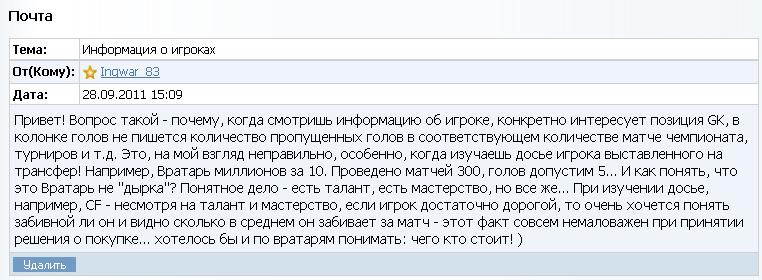 Один из менеджеров мне прислал письмо с вопросом (см. во вложении), почему в статистике у вратарей не указываются пропущенные голы?! На самом деле вопрос интересный, решил вынести на обсуждение, хотя сомневаюсь что он получит продолжение... Возможно он уже и был когда-то задан, но видимо тех времен я не застал...) Так же копирую текст письма: "Привет! Вопрос такой - почему, когда смотришь информацию об игроке, конкретно интересует позиция GK, в колонке голов не пишется количество пропущенных голов в соответствующем количестве матче чемпионата, турниров и т.д. Это, на мой взгляд неправильно, особенно, когда изучаешь досье игрока выставленного на трансфер! Например, Вратарь миллионов за 10. Проведено матчей 300, голов допустим 5... И как понять, что это Вратарь не "дырка"? Понятное дело - есть талант, есть мастерство, но все же... При изучении досье, например, CF - несмотря на талант и мастерство, если игрок достаточно дорогой, то очень хочется понять забивной ли он и видно сколько в среднем он забивает за матч - этот факт совсем немаловажен при принятии решения о покупке... хотелось бы и по вратарям понимать: чего кто стоит! )" Хотел бы узнать, можно ли такое осуществить?! -------------------- |