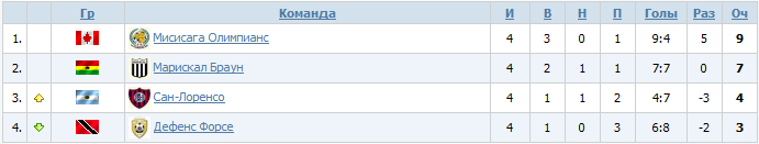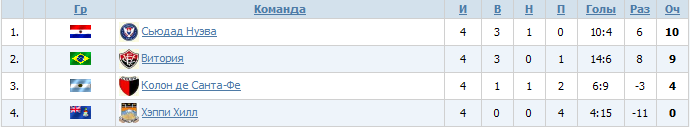Группа №5. Результативность подвела – исходы указаны точно. Колон де Санта-Фе 2:1 Витория Витория верна себе и играет одинаковой тактикой любые матчи, но вероятно против сильного соперника в гостях такая тактика не сработала, два нападающих Колона смогли найти бреши в обороне противника и забить два мяча в ответ на один, причем все мячи были забиты в первом тайме. Во втором тайме сложилось впечатление что всех все устраивает – Колон получил долгожданную победы, всего лишь вторую в нынешнем розыгрыше групповой стадии ЛЧ, Витория проиграла минимально и теперь в последнем матче её устроит и ничья. Сьюдад Нуэва 1:0 Хэппи Хилл А вот тут чуть-чуть не случилось сенсации. Если честно такое впечатление, что хозяева уже в уме выиграли матч и вышли на поле получить желаемый результат. А как можно объяснить тот факт, что первый удар по воротам Сьюдад нанес на 43 минуте???????? Правда гости не сильно атаковали, единственный удар по воротам в первом тайме на 24 минуте был, но их ьпонять можно – они приехали добывать хотя бы очко, с командой , которая одной ногой уже в 1/8 финала. Второй тайм был не лучше – команды нанесли по 2 удара по воротам. У хозяев к тому же за вторую желтую карточку был удален правый фланг Педро Фернандез. А единственный и победный мяч хозяева забили на 92 минуте. Судья после этого облегченно вздохнул (ну теперь не придется возвращать деньги) и сразу же закончил матч. И все таки не мытьем так катанием Сьюдад выходит в 1/8 с первого места и теперь оставшийся матч для него не играет никакой роли. Итог: Сьюдад вышел и осталась ещё одна вакансия на 1/8 ЛЧ. Претендента два – Витория, принимающая дома Сьюдад и Колон, играющий на выезде с Хэппи. Колон должен выигрывать, но думается вряд ли с разницей в 10 мячей значит, что бразильскому клуба достаточно сыграть с обесправофлангованным соперником дома в ничью – думаю этой команде сиё по силам, а может даже и победить. А тренеру Колона придется молится на своего непримиримого оппонента, тренера парагвайской команды. Группа №6. И опять исход угадан, ну тут и так все было понятно. Мисисага Олимпианс 1:0 Сан-Лоренсо Мисисага минимально выиграла, за счет точного удара на 42 минуте Брюс Бергена. Канадский клуб устраивала и ничья, а так даже травма левого фланга не помешала клубу оформить путевка в 1/8 финала ЛЧ. Но скорее всего тут дело не в удаче, а то что тренер соперника смирился со своей участью, это видно по морали игроков Лоренсо. Дефенс Форсе 3:1 Марискал Браун Дефенс Форс победил заслужено и закономерно, трио нападающих разорвали оборону соперника, который не сильно то и сопротивлялся – всего два удара по воротам за всю игру, видимо копит силы на решающий матч. Итог: Мисисига вышел в 1/8 с первого места, на второе место претендует сразу три команды. И зависеть все будет от двух моментов: Первый – как выйдет на игру Мисисига – бороться за квалификационные очки, или тренер даст основе отдохнуть и второй момент – как выпустит на поле своих игроков тренер Сан-Лоренсо, если они будут подготовленными к игре, и смогут выиграть у Дефенса, то они точно уже занимают третье место и продолжают биться в КЛ, а если они выиграют с разницей в два мяча, то при условии поражения Марискала с любым счетом в параллельном матче, могут и вовсе попасть в 1/8. Марискалу же , что бы точно проходить необходима победа, ибо при ничьей и выигрыш
