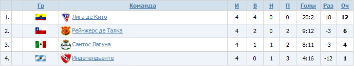 Группа №3 И опять правильно просчитанный исход обоих матчей. Атлетико Колегиалес 0:3 Роча Как и предполагалось, Роча в этом туре оформила себе путевка в 1/8 ЛЧ. Выиграли уругвайцы на классе и их соперникам не помогли родные стены, матч в одну калитку говорят в таком случае. Отличный футбол показывают футболисты уругвайской команды и не зря они продолжают играть в ЛЧ. Реал Санта-Круc 2:0 Атланте Неса И опять матч в одну калитку, примечательно что голы были забиты в начале матча и в конце его, на 3-й и 90-й минутах. Итог: Ну чтож есть один вышедший и ещё одна команда почти оформила себе вторую путевку, Реалу в последнем матче надо всего то крупно не проиграть, думаю проигрыш с разницей в 2 мяча позволит им сохранить за собой второе место. А у Атланте появляются реальные шансы попасть в КЛ и оставить победителя ЛЧ 14 сезона вообще без кубковых игр на этой стадии. Группа №4. Пополам угадано, Ботафого проснулось наконец-то. Унион Лара 1:2 Ботафого Венесуэльский клуб вроде все правильно сделал, и прессинговал по всему полю и держал мяч, но вот только толку от держания мяча? А футболисты бразильского клуба взяли на вооружение девиз Кержакова – как только получали мяч – сразу по воротам лупили и налупили таки на один больше чем пропустили, в итоге Унион уже в этом матче должен был решать проблему выхода в 1/8, но не суждено, на радость Ронни. Кокимбо Унидо 1:0 Сад Америка Гости, по словам главного тренера отскочили в этом туре. Вроде и атаковали чаще, и мяч больше контролировали, вот только забить не смогли, а футболисты Кокимбо смогли, один раз правда, но и этого достаточно оказалось, для выхода в 1/8 финала, с чем их искренне и поздравляем. Итог: Кокимбо в 1/8, не понятно только с какого места. А вторая путевка будет разыграна в матче тура: Сад Америка - Унион Лара, причем Сад удовлетворит и ничья, потому что тогда они проходят по пятому дополнительному показателю: - больше число побед на выезде; у Сада она одна у Лары нет ни одной. Так что Унион сегодняшним проигрышем поставил себя в очень тяжелое положение, вероятнее всего лишил себя места в 1/8 ЛЧ. Вероятность того, что Сад дома проиграет очень мала, хотя….. У Ботафого шансы продолжить играть есть только в КЛ, но для этого надо самим крупно выиграть, скажем 4:0 и надеяться что Сад с таким же счетом одолеет Унион. остальное завтра, господа. -------------------- Бывший (2-16 сезоны) тренер Сборной Перу