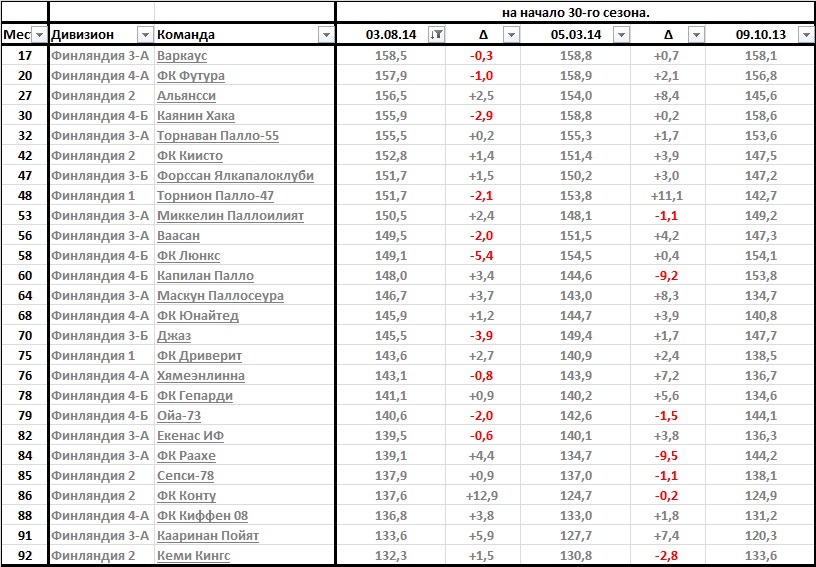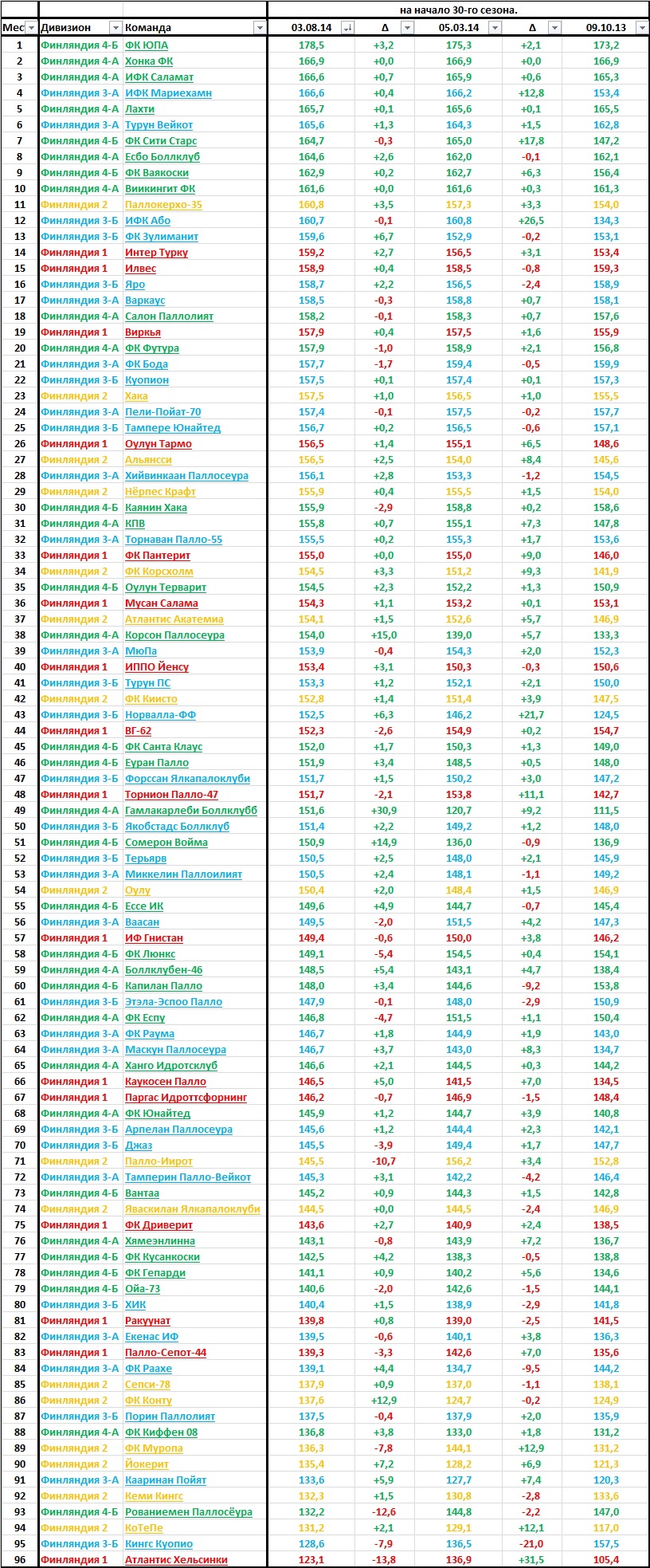 Статистика роста/падения командного мастерства по средней силе 11-ти лучших игроков с 2015.12.06 по 2016.05.08 Общая статистика роста/падения по стране Финляндия.Место...▲▼.......Команда.................Менеджер..................С11 средн....Пред. замер...Прирост ± 1..............ФК ЮПА..................Azure.......................179,40......( 170,61 ).....8,79 2..............Турун Вейкот............WBB.........................170,55......( 168,15 ).....2,40 3.....▲ +2.....Паллокерхо-35...........and18_09....................166,07......( 163,80 ).....2,27 4..............МюПа....................sashab32....................164,55......( 160,31 ).....4,24 5.....▲ +1.....Виикингит ФК............Benderr.....................164,14......( 160,26 ).....3,88 6.....▼ -1.....Паргас Идроттсфорнинг...Dedsan......................164,09......( 165,85 )....-1,76 7.....▼ -1.....Мусан Салама............eskander....................164,06......( 161,98 ).....2,08 8.....▲ +4.....Оулун Тармо.............Кэп 72......................162,95......( 160,98 ).....1,97 9.....▲ +2.....Виркья..................Surveyor....................162,03......( 161,12 ).....0,91 10....▲ +4.....Интер Турку.............funcskamoscow...............162,00......( 157,00 ).....5,00 11....▲ +2.....ФК Санта Клаус..........Naamah......................161,57......( 157,08 ).....4,49 12....▼ -2.....Илвес...................vovan-55....................159,92......( 159,00 ).....0,92 13....▲ +3.....Хийвинкаан Паллосеура...VIP-3 ZeRRega...............159,56......( 160,55 )....-0,99 14....▲ +2.....ФК Зулиманит............Romashishka13...............158,81......( 154,47 ).....4,34 15....▲ +3.....ВГ-62...................nightfly13..................158,46......( 159,38 )....-0,92 16....▲ +4.....Есбо Боллклуб...........Osama.......................157,62......( 150,49 ).....7,13 17....▼ -2.....ИФ Гнистан..............КУЗЬМА_74...................157,51......( 161,82 )....-4,31 18....▲ +2.....ИФК Саламат.............mniam.......................157,39......( 151,22 ).....6,17 19....▲ +4.....Оулу....................yla2003.....................157,18......( 156,24 ).....0,94 20.............Корсон Паллосеура.......istok.......................157,04......( 154,60 ).....2,44 21....▲ +2.....Этэла-Эспоо Палло.......Mikhalych13.................156,80......( 157,30 )....-0,50 22.............ФК Дриверит.............лихчай......................156,41......( 152,35 ).....4,06 23....▼ -2.....ФК Бода.................zaneva......................156,12......( 152,40 ).....3,72 24....▲ +3.....Якобcтадс Боллклуб......nuke89......................156,07......( 154,26 ).....1,81 25....▲ +1.....Салон Паллолият.........ГЃГҐГ§ ìåГåäæåðà ...155,17......( 150,83 ).....4,34 26....▲ +1.....Хонка ФК................chelentano..................155,14......( 149,70 ).....5,44 27....▼ -5.....Яваскилан Ялкапалоклуби.kamigami....................155,09......( 157,86 )....-2,77 28....▲ +4.....КоТеПе..................sbn1977.....................154,99......( 153,39 ).....1,60 29....▼ -3.....ФК Пантерит.............BOROH.......................154,96......( 157,42 )....-2,46 30....▲ +3.....Нёрпес Крафт............Armen.......................154,95......( 153,54 ).....1,41 31.............Спартак Хельсинки.......romlet......................153,98......( 154,22 )....-0,24 32.............ИППО Йенсу..............Stahlhelm...................153,92......( 154,00 )....-0,08 33....▼ -2.....Палло-Сепот-44..........ГЃГҐГ§ ìåГåäæåðà ...153,61......( 159,25 )....-5,64 34....▼ -1.....Оулун Терварит..........albel.......................153,18......( 153,33 )....-0,15 35....▼ -11....Ракуунат................Galmor......................153,12......( 164,75 )....-11,63 36....▲ +2.....Терьярв.................buhenvald1..................152,84......( 153,11 )....-0,27 37....▲ +8.....ИФК Або.................Tabunshchyk.................152,35......( 123,44 ).....28,91 38....▲ +1.....Хака....................judge.......................152,19......( 147,67 ).....4,52 39....▼ -2.....Сомерон Войма...........Bambarbiya..................152,04......( 150,66 ).....1,38 40....▲ +2.....Палло-Иирот.............Roman1983...................149,92......( 152,96 )....-3,04 41....▼ -1.....ФК Муропа...............ГЃГҐГ§ ìåГåäæåðà ...149,67......( 153,21 )....-3,54 42....▲ +2.....Лахти...................vvld1.......................148,09......( 141,68 ).....6,41 43....▼ -2.....Яро.....................Conde.......................148,04......( 147,68 ).....0,36 44.............ФК Сити Старс...........W o W.......................147,74......( 146,12 ).....1,62 45....▼ -2.....Арпелан Паллосеура......Ukrop1......................147,73......( 146,50 ).....1,23 46.............Тампере Юнайтед.........maxim_netafim...............147,62......( 143,56 ).....4,06 47....▼ -2.....Пели-Пойат-70...........winbarca10..................147,17......( 144,99 ).....2,18 48.............Кингс Куопио............ГЃГҐГ§ ìåГåäæåðà ...140,24......( 144,27 )....-4,03 49....▼ -10....ФК Раума................ГЃГҐГ§ ìåГåäæåðà ...139,77......( 158,84 )....-19,07 50....▲ +1.....Каукосен Палло..........drusha......................139,73....