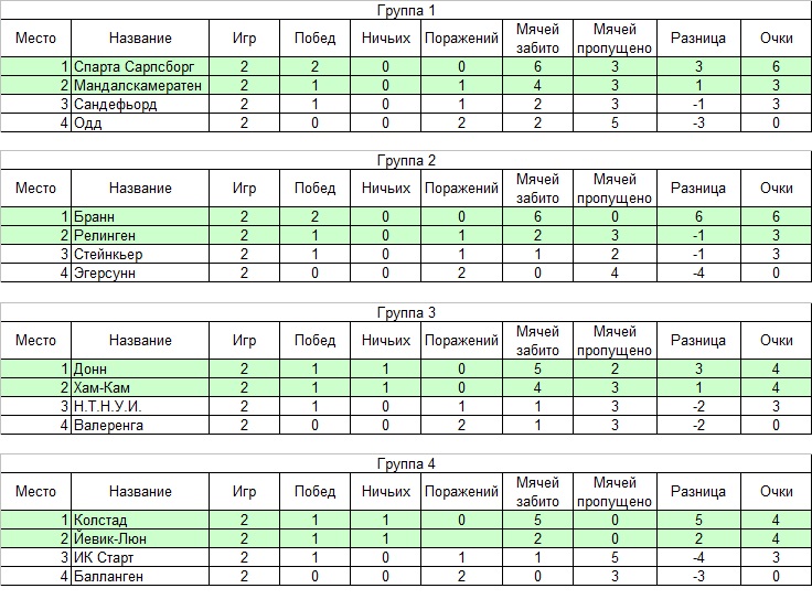 Группа 1 В состав группы вошли прошлогодний победитель "Мандалскамератен", "Сандефьорд", "Одд" (бывший "Одд Гренланд"), представляющие высший норвежский дивизион, и "Спарта Сарпсборг" из 3-А. "Мандалскамератен" 3-0 "Сандефьорд" Прошлогодний победитель уверенно начал защиту своего титула, в первом матче одолев грозный "Сандефьорд". Уже в дебюте встречи Раймонд Хофстейдтер обеспечил своей команде преимущество в счете. Он же во втором тайме удвоил его. Ну а под занавес встречи нападающий хозяев уже отдавал голевой пас на своего партнера Эндре Омланда. "Одд" 2-3 "Спарта Сарпсборг" "Одд" на правах представителя высшего дивизиона Норвегии и хозяина поединка начал мощно! Уже на 3 минуте счет был открыт усилиями Сверре Орфлота. В дальнейшем хозяева также продолжили действовать активнее и создавать моменты, но реализовать их не получалось. А вот гостям улыбнулась удача, по сути, в первой же своей атаке они счет сравняли. Оливер Сэта вошел в штрафную и неотразимо пробил. Футболисты "Одда" продолжили штурмовать ворота гостей, но на последнем рубеже безупречно действовал Томас Ливерос Матсгорд, который раз за разом разгадывал замыслы нападающих. Во втором тайме игра выровнялась и успокоилась. И тут как гром среди ясного неба стал гол Матса Андре Адсена на 83 минуте, выведший гостей вперед! Не успели игроки и болельщики "Одда" прийти в себя, как Керье Харальд Вердаль похоронил все их надежды на положительный исход матча. Все что удалось хозяевам - это отквитать один из мячей усилиями все того же Сверре Орфлота. Группа 2 В группе принимают участие три представителя первенства Норвегии 3-Б - "Бранн", "Релинген" и "Эгерсунн". Также к ним примкнул "Стейнкьер" с дивизиона 3-А. "Эгерсунн" 0-3 "Бранн" (ТП за превышение МУСК) Хозяева стали заложниками травмы на 86 минуте матча. К тому моменту счет на табло был 2-1 в их пользу. Однако выход более мастеровитого центрального защитника взамен травмированного привел к превышению МУСК и ТП. Необходимо отметить и гостей, которые по игре были посильней и проигрыша точно не заслуживали. "Релинген" 2-0 "Стейнкьер" В целом можно отметить, как матч равных соперников. Хозяева в дебюте встречи добились преимущества в счете благодаря голу Кэллама Бакерфилда. В дальнейшем на поле шла равная игра, где чуть более острыми выглядели игроки "Стейнкьера". Но повезло опять "Релингену" - в контратаке на 77 минуте Том Полсен удвоил преимущество своей команды и установил окончательный счет поединка 2-0. Группа 3 В этой группе собралась разношерстная компания. К неоднократному победителю нашего турнира "Н.Т.Н.У.И." из высшего дивизиона добавились "Донн" из Норвегии-2, "Хам-Кам" из 3-Б и "Валеренга" из 3-А. "Валеренга" 1-2 "Хам-Кам" Хозяева выставили менее мастеровитый состав, нежели допускается. К тому же в процессе плановых замен, проведенных во втором тайме, общее мастерство хозяев еще более уменьшилось. В целом гости в первой половине гости добились уверенного перевеса в два мяча. "Валеренга" под занавес встречи один мяч отквитала, но на большее времени у хозяев не оставалось. "Донн" 3-0 "Н.Т.Н.У.И." (ТП за превышение МУСК) Многократный победитель турнира и самый титулованный клуб нашего Кубка также стал жертвой травмы - на 40 минуте вместо травмированного центрального защитника Юсуфа Талбакова вышел более мастеровитый Ивар Андреас Мартинсен. В результате данной замен