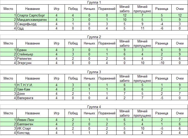 "Спарта Сарпсборг" 3-0 "Хам-Кам" (ТП за превышение МУСК) К сожалению, гости не выставили состав на игру и превысили МУСК. В итоге техническое поражение. "Н.Т.Н.У.И." 1-3 "Мандалскамератен" Этот матч был повторением прошлогоднего финала. Напомню, тогда "Мандаскамератен" одержал победу со счетом 3-1 и сместил с верхней ступеньки пьедестала "Н.Т.Н.У.И." (пятикратного победителя турнира!). В этом году "Н.Т.Н.У.И." был решительно настроен на реванш! Начало встречи осталось за хозяевами, на левом фланге был активен Никодемусен, который сначала на 8 минуте ушел от соперников и пробил в ближний угол. На 11 минуте он выступал уже в роли ассистента, но навес прошел слишком близко у линии поля и далековато от ворот, удар Гштоля пришелся мимо ворот. На 25 минуте его навес пришелся точно на голову Лиену, но удар головой вновь пришелся мимо створа. Гости постепенно отодвинули игру от своих ворот, а на 40 минуте создали первый момент, Свейндал длинной передачей вывел Форсса на ударную позицию, который отблагодарил партнера точным ударом! Получив ценные указания в перерыве, команды вышли на вторую половину. Хозяева однозначно требовалось поправить прицел! И первый же момент принес им успех. На 56 минуте получился гол-близнец, что и в их ворота. Передачу с центра поля от бровки от Никодемусена замкнул Гштоль! Настроение у публики повысилось! Трибуны гнали своих любимцев, но опасные моменты начали создавать гости. Омланд вывел Форсса на убойную позицию, но в эпизоде блестяще сыграл вратарь! Ответ хозяев был еще опасней, удар Гштоля с линии штрафной и последующее добивание с угла вратарской, но вновь прекрасная игра вратаря (но уже другого!). Матч близился к завершению, интрига нарастала и развязка случилась за 10 минут до финального свистка. Навес с угла вратарской в гол превратил Форсс, выведя гостей вперед и доведя бомбардирский счет до 8 мячей! В компенсированное время успех гостям принесла еще одна фланговая атака, на этот раз на острие оказался Омланд. 3-1 победа "Мандалскамератена"! "Релинген" 6-1 "Старт" Камня на камне не оставил "Релинген" в первом поединке от соперника! Так хозяева были расстроен потерей единоличного лидерства в чемпионате! 6 мячей влетело в ворота гостей, которые провели лишь одну результативную атаку. Тим Полсен и Баккерфилд оформили по хет-трику! Полсен с 13 мячами увеличил свое преимущество в гонке бомбардиров! "Йевикл-Люн" 1-1 "Стейнкьер" Завсегдатай нашего турнира "Йевик-Люн" принимал "Стейнкьер"! На групповом этапе обе команды зарекомендовали себя с наилучшей стороны! Первый штурм хозяев не увенчался успехом. Снортеланн не успел пробить из выгодной позиции в самом начале, а после опасных моментов уже не было. Постепенно гости выровняли игру и уже сами создали опасность, Уднессвеен бил из пределов штрафной в борьбе с защитником. Видимо этот факт и помешал ему пробить точнее, удар пришелся во вратаря! Но этот факт его не огорчил,аи на 26 минуте он замкнул навес партнера! Запал хозяев после пропущенного мяча хватило на дальний неточный удар и инициатива вновь перешла к гостям, которые начали создавать моменты! В одном из эпизодов вратарь был уже обыгран, но путь мячу в ворота преградил защитник "Йевика"! Стартовый свисток второго тайма оживил трибуны! Они надеялись, что их футболистам удастся отыграться! На 61 минуте их мечты воплатил в реальность Дэмиен 