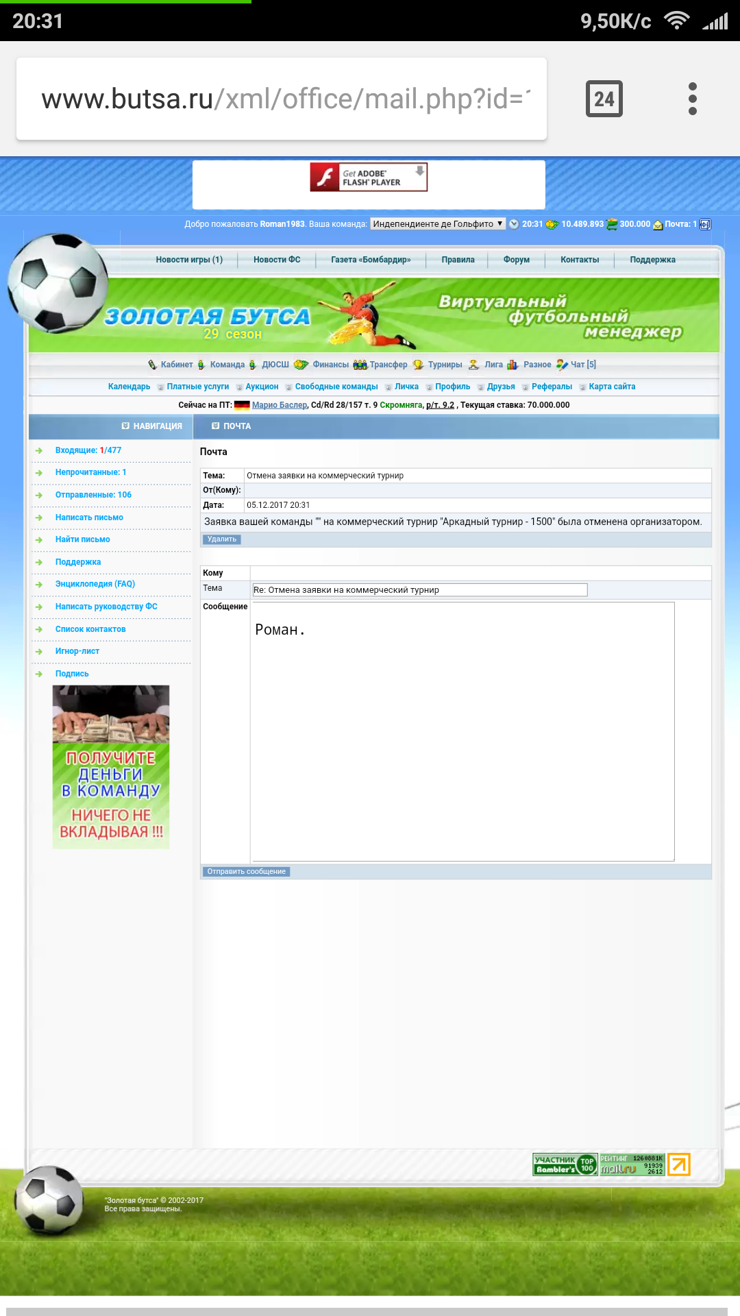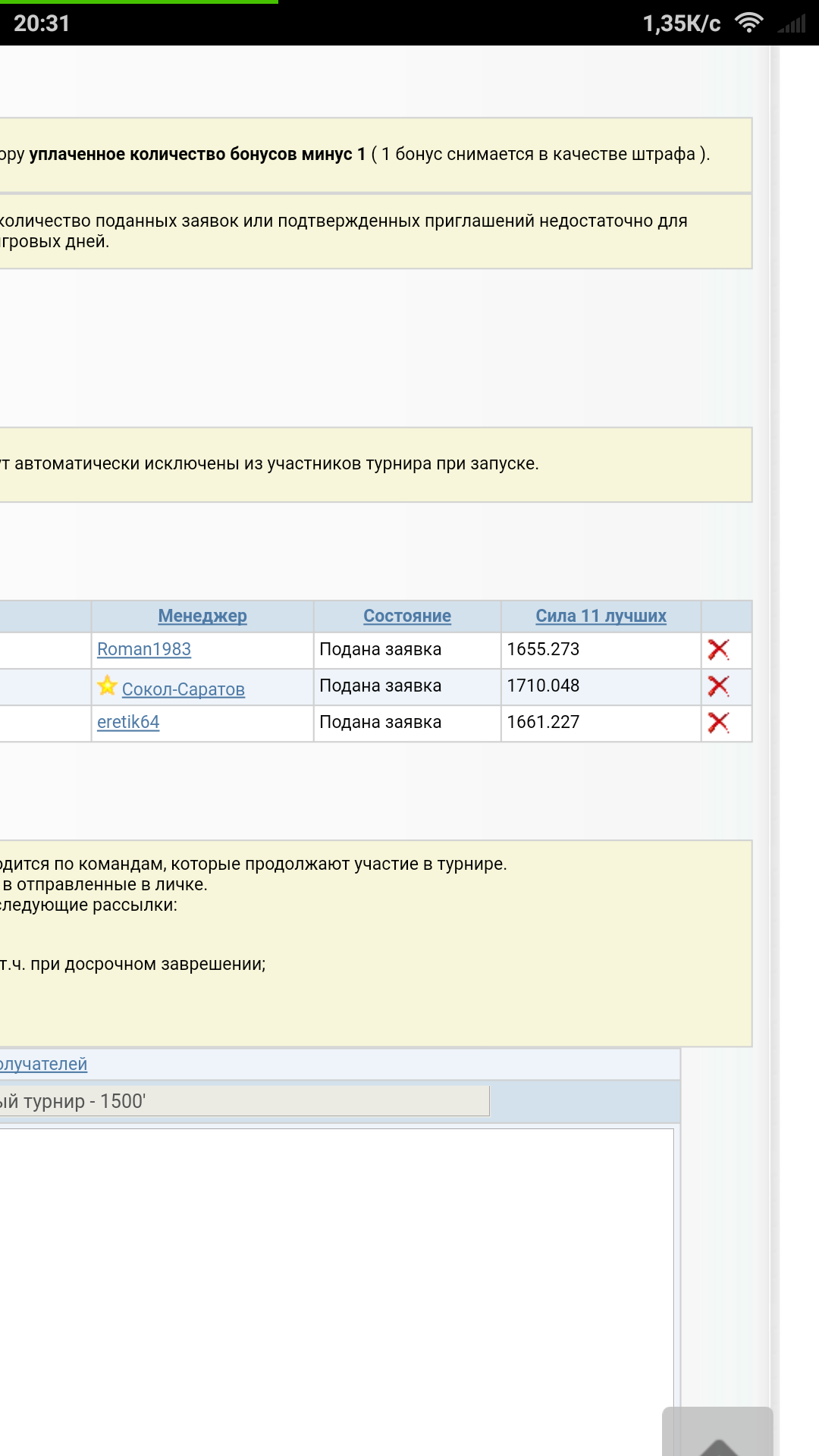 Вот смотри. Крестик и письмо, которое приходит отклоненному участнику. Да, но у тебя платный турнир. Ты же за него платишь 1 бонус за создание. А у меня бесплатный. Я не увидел там крестиков. Да и с роду у меня там не было крестиков. Вон, у тебя они даже тогда, когда не набрались участники - я бы заметил крестики эти. Сообщение отредактировал Dimionius_84 - 5.12.2017, 21:52 -------------------- |