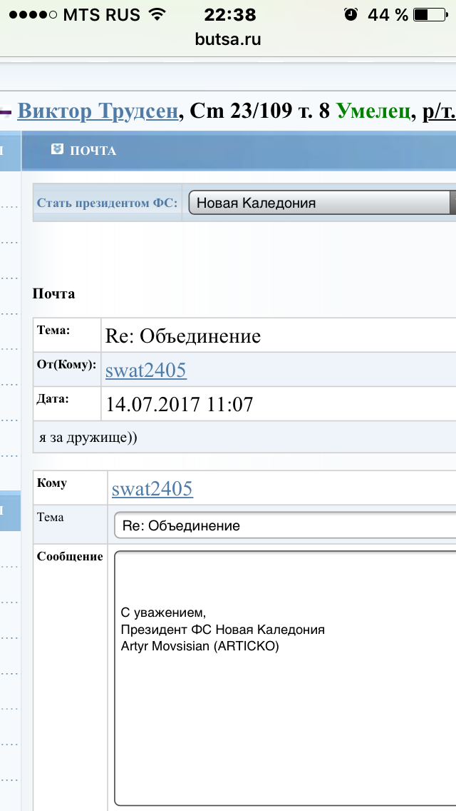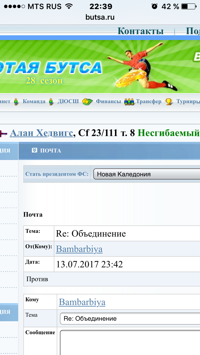 Дату взятия команды приложить не забудь.)) Такое ощущение, что он команду взял лишь для того, чтобы высказать свое фи, хотя сам почти никакого отношения к данному ФС не имеет на самом деле. Очень даже может быть. Команду взял вчера вечером. Тема: Новичок в ФС! От(Кому): Liga Дата: 13.07.2017 20:57 Внимание! Команда А.К.Б. Пойя (ID 7653) [ http://www.butsa.ru/roster/7653 ] обрела нового менеджера Иван Иванов(Bambarbiya) [ http://www.butsa.ru/users/395385 ]. |