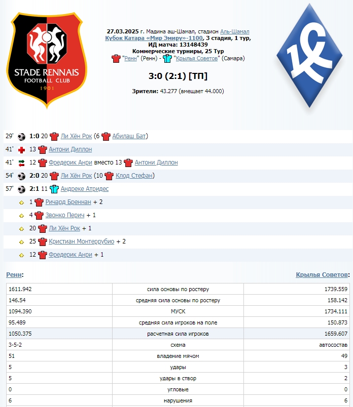 Не иначе, гену на МедиаЛигу натаскивают. Иначе не объснишь, как никакая команда 95 обыграла очень даже какую команду 150 ... и еще перебегала и перебила ее. И даже забила два гола. Очень хотелось бы узнать установки на этот матч от Ренна, разница в силе очень уж неприличная) -------------------- |