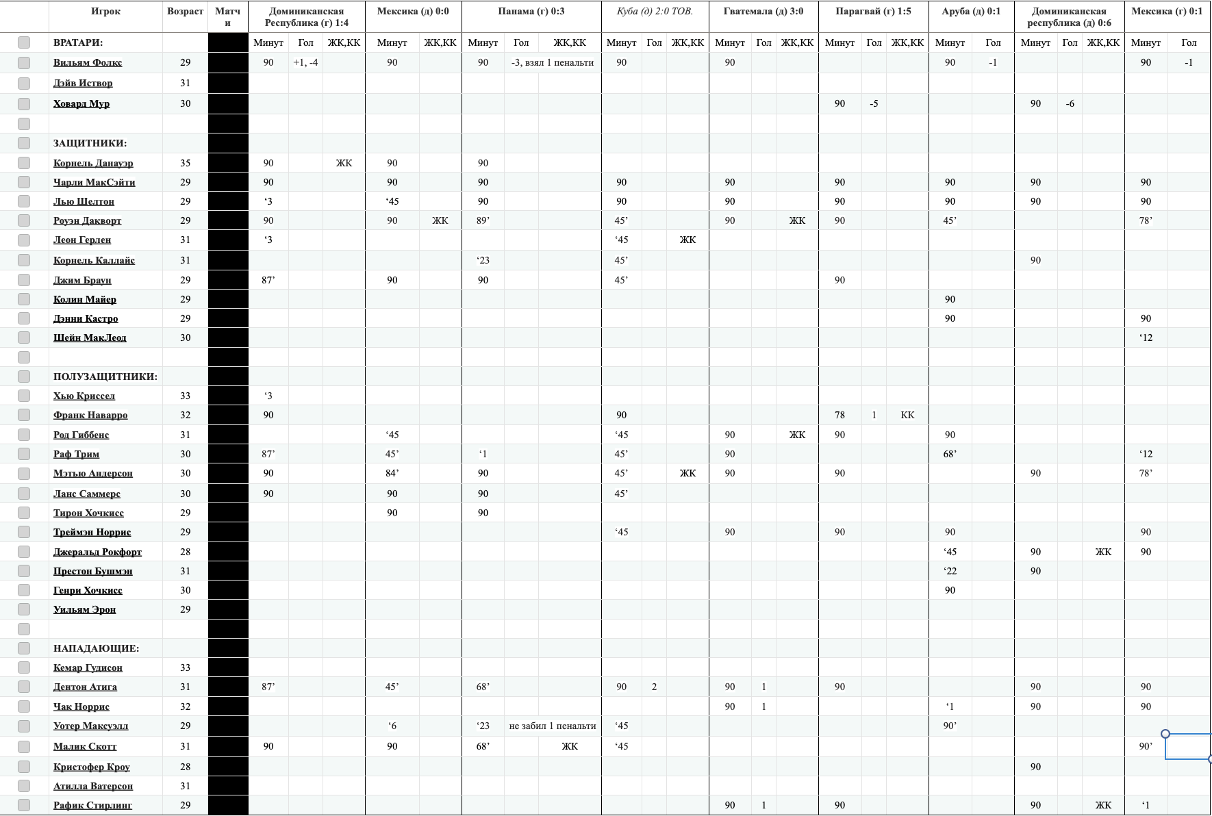 Возможно, опрометчиво поступил я с составом. Накануне объявил же о новичках в этом сезоне в составе сборной. Трое из них - Кастро, Хочкисс и Майер - вышли в стартовом составе. Еще двое - Рокфорт и Бушмэн - вышли на замену. Извините, ребята, но все они вернутся в клубы с подорванной моралью. Если только сегодня не произойдет чуда и не порвем одного из лидеров - Доминиканскую республику. Но и то играть из вчерашних в этом матче будут далеко не все. Результаты 7 тура: Ямайка - Аруба 0:1 (0:1) Гол: Омар Миллс, 3 Гватемала - Парагвай 2:5 (1:3) Голы: Альфредо Фигуереда, 19, 25 (0:1, 0:2), Хуан Матта, 29 (1:2), Альфредо Фигуереда, 45 (1:3), Энирке Сандовал, 77 (1:4), Альфредо Фигуереда, 84 (1:5), Хуан Матта, 86 (2:5) Панама - Доминиканская Республика 2:0 (0:0) Голы: Фернандо Хулио Мэннинг, 59, 85Турнирная таблица после 1 круга ![]() Статистика наших игроков -------------------- |