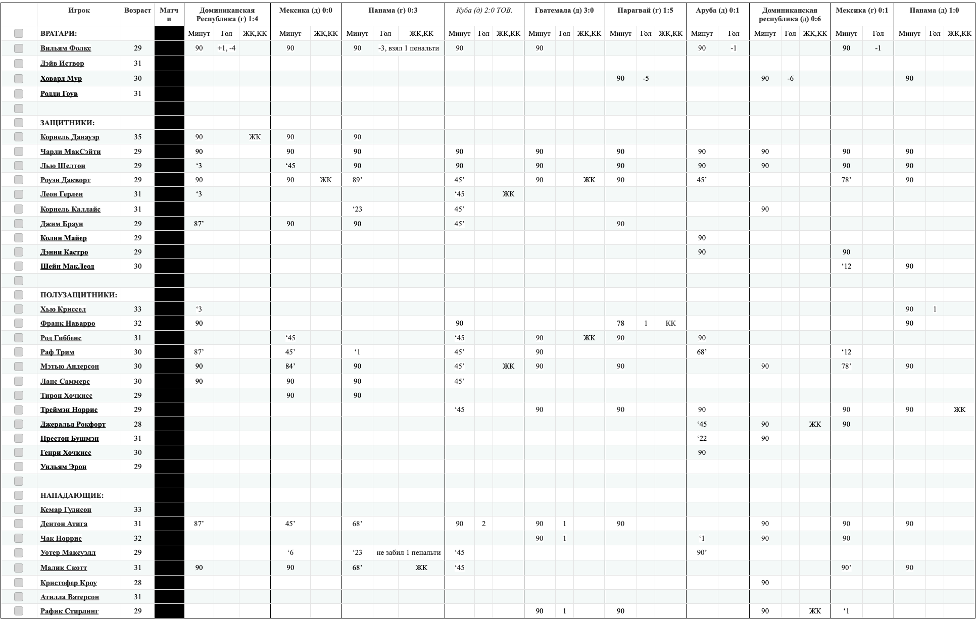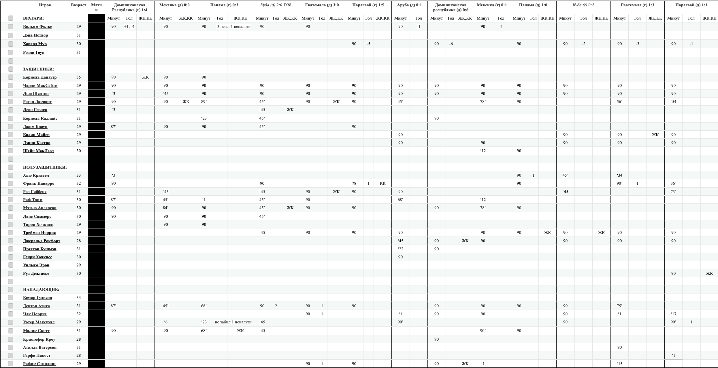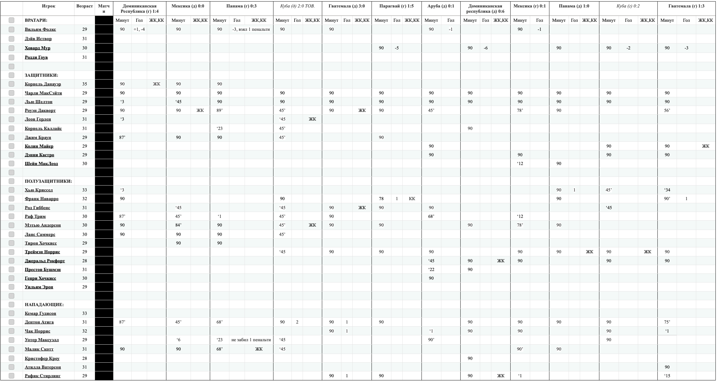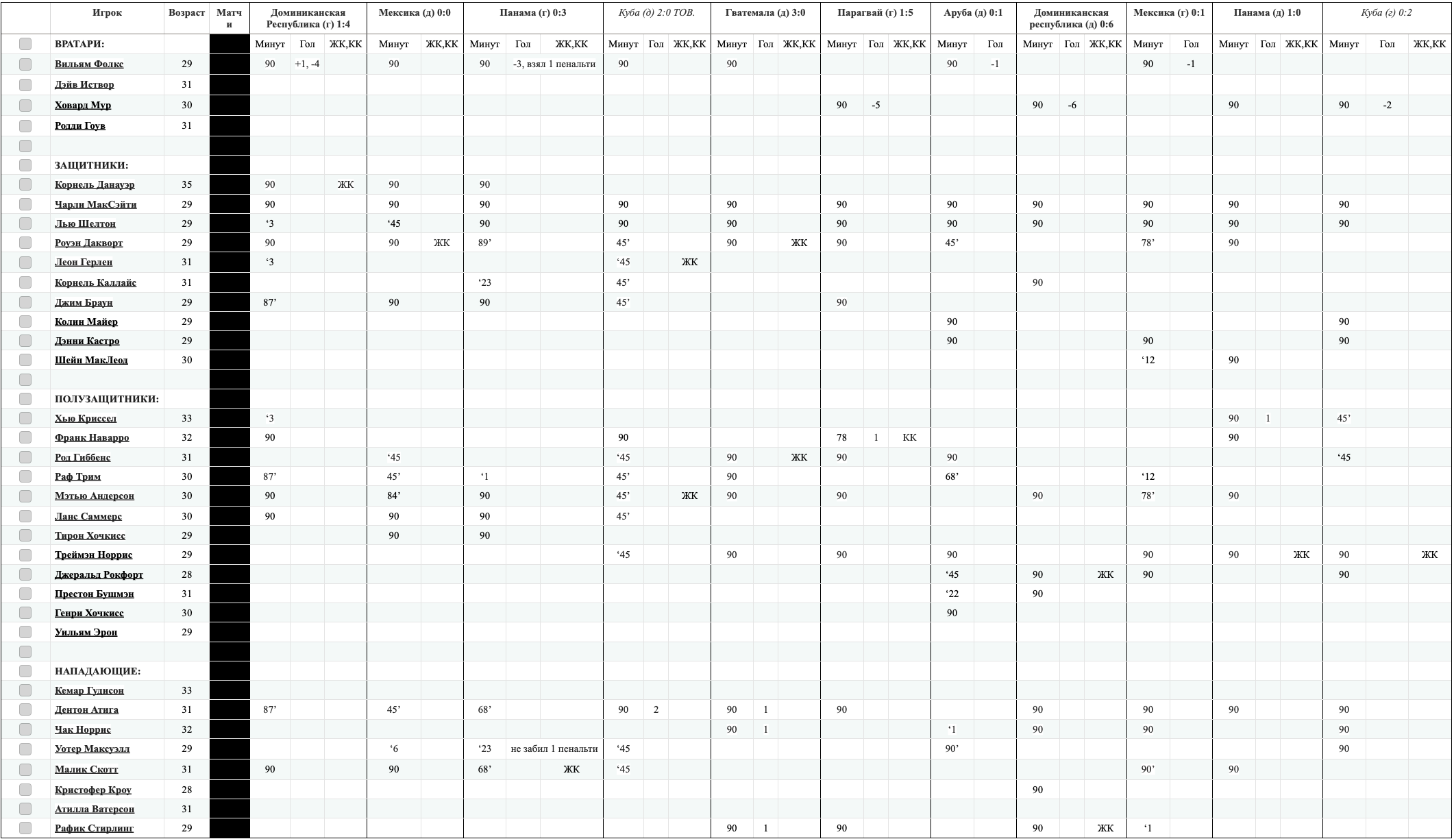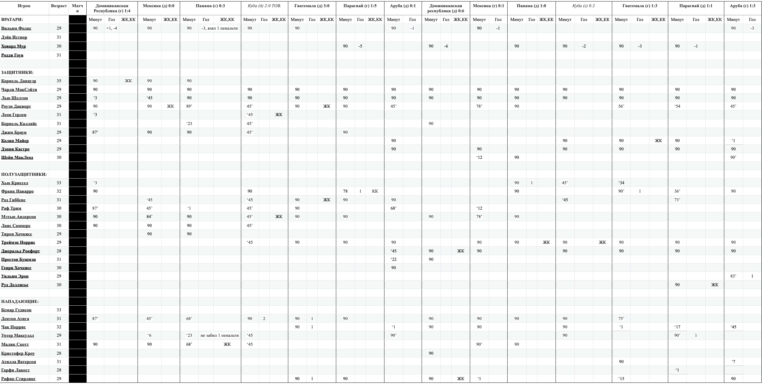 Вместо основного голкипера Вильяма Фолкса, выступающего в России за астраханский Волгарь-Газпром, вызван Родди Гоув из нашего Лэйсерс. Гоув за сборную еще не заигран. В полузащите вместо Рафа Трима, выступающего в латышской Блазма, возвращен в сборную Хью Криссел из мексиканского Атлас. В этом сезоне Криссел сыграл 3 минуты за сборную, выйдя на замену в первом матче в Доминиканской Республике. -------------------- |
