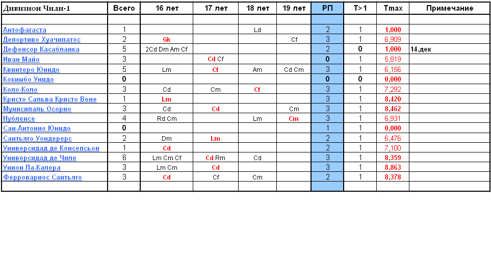 ![]() В дивизионе один свободный клуб - Универсидад Католика Прошел набор юниоров в ДЮСШ дивизиона. Всего набрано 28 игроков. Самый большой набор в ДЮСШ клубов Депортес Копиапо и Депортес Маипо - по 4 игрока. От набора воздержался один клуб - Депортес Темуко. С открытием сезона из ДЮСШ были выпущены следующие игроки Депортес Консепсьон - Dm 19 лет Т1 и Cm 19 лет Т1 Рейнджерс Талька - Gk 17 лет Т7 Выносливый С.Т. Сантьяго - Am 18 лет Т6 Выносливый В ДЮСШ дивизиона еще находятся 5 игроков 19 лет, трое из них тренируют Талант. -------------------- |