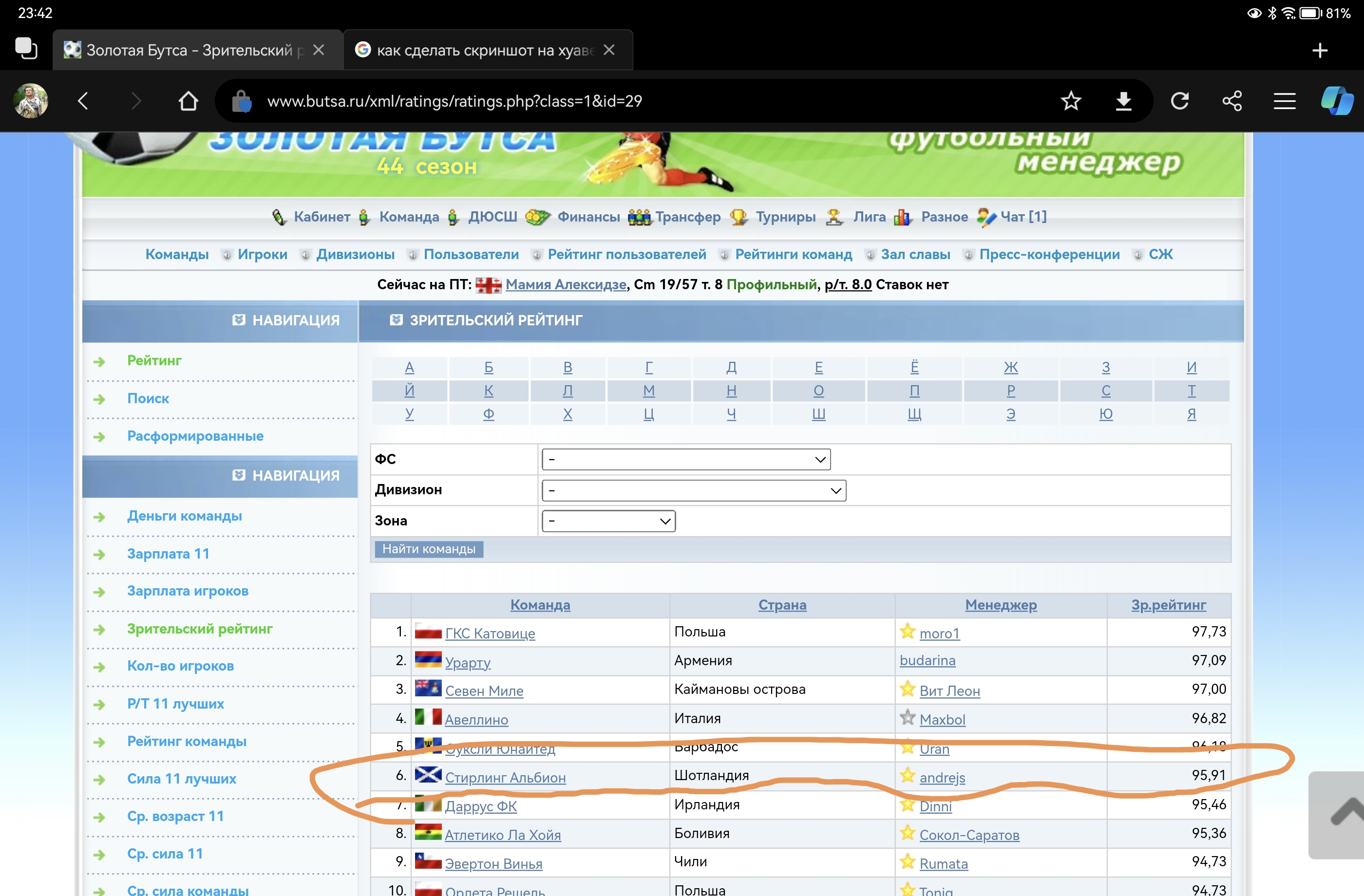 Стирлинг, наверное, достиг возможной для себя вершины "могущества" - 6 место по рейтингу Неплохо. Нужно качать игроков а остальное придет -------------------- Президент Шотландии 16,17,18 сезонов