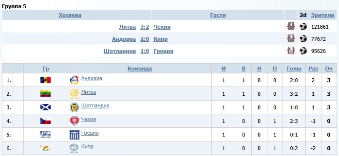Андорра: Рейтинг - 618.044. Сила - 183.64 Шотландия: Рейтинг - 500.818. Сила - 187.36 Греция: Рейтинг - 360.476. Сила - 178.09 Чехия: Рейтинг - 205.668. Сила - 180.00 Литва: Рейтинг - 772.459. Сила - 185.64 Мы начинаем с Рейтингом 267.309 и Силой 178,91. Дома можно обыграть Грецию и Чехию, попробовать потягаться с Андоррой, а вот в гостях любые очки станут чудом. -------------------- |