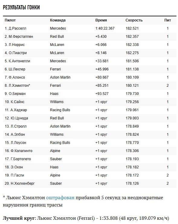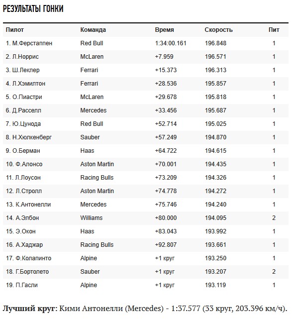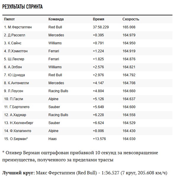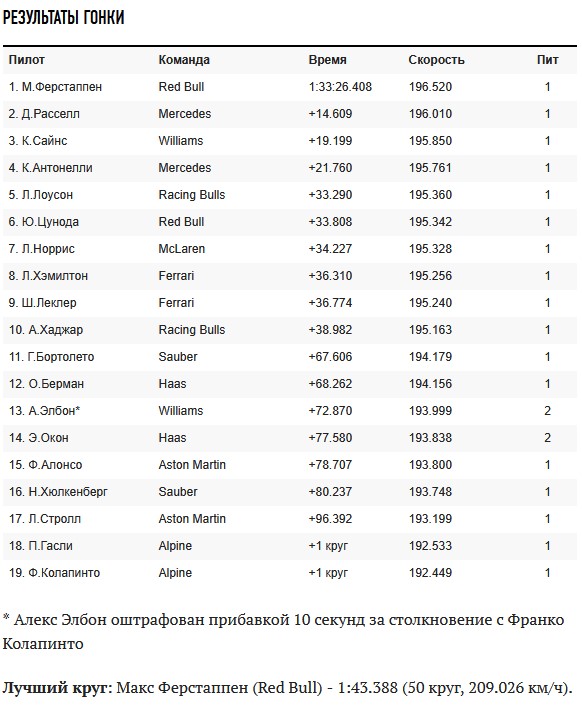 ![]() Гонщики: 1. Ферстаппен: 8 + 3 (победа в спринт-квалификации) + 1 (быстрейший круг в спринте) = 12 2. Расселл: 7 3. Сайнс: 6 4. Хэмилтон: 5 5. Леклер: 4 6. Албон: 3 7. Цунода: 2 8. Антонелли: 1 Шасси: RB: 14 Ferrari: 9 Williams: 9 Mercedes: 8 Моторы: Honda: 12 + 2 = 14/2 = 7 Ferrari: 5 + 4 = 9/2 = 5 Mercedes: 7 + 6 + 3 + 1 = 17/4 = 4 ![]() Гонщики: 1. Ферстаппен: 25 + 5 (победа в квалификации) = 30 2. Норрис: 18 3. Леклер: 15 + 3 (гонщик дня) = 18 4. Хэмилтон: 12 5. Пиастри: 10 6. Расселл: 8 7. Цунода: 6 8. Хюлкенберг: 4 9. Берман: 2 10. Алонсо: 1 ------------------------------------------------------------- 13. Антонелли: 3 (быстрейший круг в гонке) Шасси: RB: 36 McLaren: 28 Ferrari: 27 Mercedes: 11 Kick Sauber: 4 VF-25: 2 Aston Martin: 1 Моторы: Honda: 30 + 6 = 36/2 = 18 Mercedes: 18 + 10 + 8 + 3 + 1 = 40/5 = 8 Ferrari: 15 + 12 + 4 + 2 = 33/4 = 8 ![]() Общее турнирное положение команд: ![]() Турнирное положение команд второй части конкурса: ![]() -------------------- |