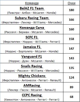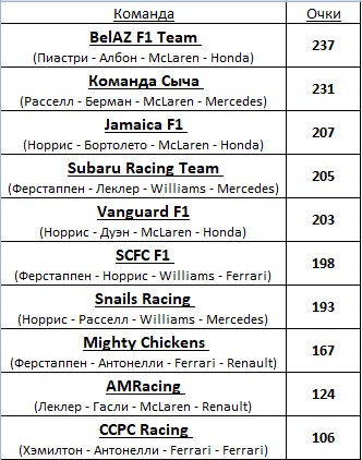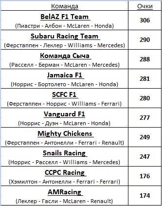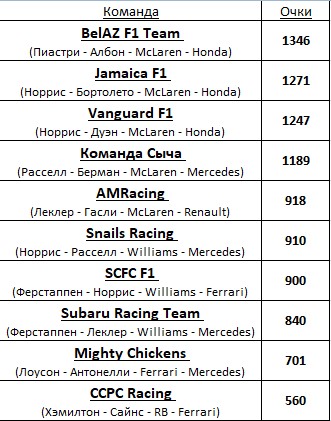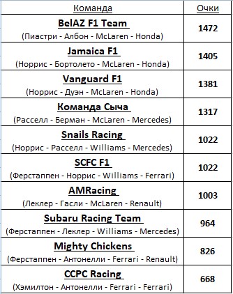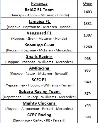 Участники Конкурса: 1. Vanguard F1 VFarkhad (Норрис - Дуэн - McLaren - Honda) 2. CCPC Racing Reginald McLucky (Хэмилтон - Сайнс - RB - Ferrari) 3. BelAZ F1 Team Hedonizmbot (Пиастри - Албон - McLaren - Honda) 4. Mighty Chickens Hyper Chicken (Лоусон - Антонелли - Ferrari - Mercedes) 5. Команда Сыча Кот Говорун (Расселл - Берман - McLaren - Mercedes) 6. Jamaica F1 Dinni (Норрис - Бортолето - McLaren - Honda) 7. SCFC F1 Котик Киприотик (Ферстаппен - Норрис - Williams - Ferrari) 8. Snails Racing Vecchiardo (Норрис - Расселл - Williams - Mercedes) 9. Subaru Racing Team Iwer (Ферстаппен - Леклер - Williams - Mercedes) 10. AMRacing alextoga (Леклер - Гасли - McLaren - Renault) ----------------------------------------------------------------------- тур №1 тур №2 тур №3 тур №4 тур №5 тур №6 тур №7 тур №8 тур №9 тур №10 тур №11 тур №12 тур №13 тур №14 Выплаты за первую часть конкурса: 1. Vanguard F1 - VFarkhad - 6 000 000 2. AMRacing - alextoga - 5 000 000 3. Mighty Chickens - Hyper Chicken - 2 500 000 4. CCPC Racing - Reginald McLucky - 1 500 000 Сообщение отредактировал VFarkhad - 24.9.2025, 9:41 -------------------- |