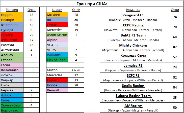 ![]() Гонщики: 1. Ферстаппен: 25 + 5 (победа в квалификации) + 3 (лучший круг) = 33 2. Расселл: 18 3. Сайнс: 15 + 3 (гонщик дня) = 18 4. Антонелли: 12 5. Лоусон: 10 6. Цунода: 8 7. Норрис: 6 8. Хэмилтон: 4 9. Леклер: 2 10. Хаджар: 1 Шасси: RB: 41 Mercedes: 30 Williams: 15 VCARB: 11 McLaren: 6 Ferrari: 6 Моторы: Honda: 33 + 10 + 8 + 1 = 52/4 = 13 Mercedes: 18 + 15 + 12 + 6 = 51/4 = 13 Ferrari: 4 + 2 = 6/2 = 3 ![]() Общее турнирное положение команд: ![]() Турнирное положение команд второй части конкурса: ![]() -------------------- |