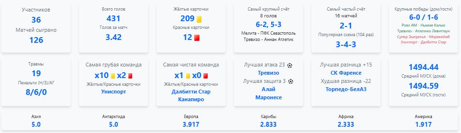 Начиная с первого раунда (первый групповой этап), производится начисление баллов в рейтинг континентов по системе: 1. Первый и второй раунд (групповые этапы) - за победу 1 балл, за ничью 0,5 балла. Набранные баллы всех представителей континента суммируются. Далее делятся на количество участников битвы и образуют клубный рейтинг континента. 2. Плей-офф - за победу 2 балла, за ничью 1 балл. 3. Финал - за победу 4 балла (в доп время или по пенальти - 3 балла победителю, а 1 балл финалисту). 4. Матч за 3-е место - за победу 3 балла (в овертайме или по пен - 2 балла бронза, а 1 балл за деревянные медали). 5. 1 бонусный балл начисляется команде, вышедшей в следующий раунд, начиная с плей-офф. Азия - 5,0 Хетт (Далбитти Стар) - 6 ADAMYCH (Кроатиа Сесвете) - 5,5 vladab (Уиллоуфилд Пэриш) - 3 Denim Demedj (Алай) - 6 xomza (Мазур) - 4 Раштав (Полония) - 5,5 Групповые этапы - 26 победы, 8 ничьи, 8 поражения, 30 очки Антарктида - 5,0 Дацюк (Победа) - 5,5 ВЕЛДЕР (Маронесе) - 5 Jec (Гзира) - 4 BVB 09 Dortmund (ПФК Севастополь) - 5 shikpavel78 (Морекеймб) - 4,5 john7624 (СК Фаренсе) - 6 Групповые этапы - 28 победы, 4 ничьи, 10 поражения, 30 очки Европа - 3,917 StaRicK (Зенит) - 3 Fedes14 (Поллок) - 3 Stanton (Тревизо) - 5 Villas-Boas (Роял АМ) - 4 Billy Razor (Канапиро) - 3 mik994 (Ольбия) - 5,5 Групповые этапы - 20 победы, 7 ничьи, 15 поражения, 23,5 очки Карибы - 2,883 Баныч (Итакуруба) - 3,5 yellow man (Аллоа Атлетик) - 3,5 KaNaDa (Аннан Атлетик) - 3 Negero (Нымме Калью) - 1,5 darvin (Арсенал Парамарибо) - 2 Dinni (Тон Пентре) - 3,5 Групповые этапы - 12 победы, 10 ничьи, 20 поражения, 17 очки Африка - 2,333 Diplomat (Супер Эштрелья) - 1,5 S. A. S. (Ван Жукинг) - 1,5 Иванычч (Торпедо-БелАЗ) - 0 Odi-City (Нассау Пайретс) - 5 simone_perotta (Гуарани Кампинас) - 2 Roman1983 (Косса) - 4 Групповые этапы - 11 победы, 6 ничьи, 25 поражения, 14 очки Америка - 1,917 Вит Леон (Клеменси) - 0 Beloborodov (Униспорт) - 1 Ludius (Мелита) - 4 John Harder (Ньюпорт Каунти) - 2,5 AWLesley (Атлетико Левиттаун) - 0 лихчай (Лулео) - 4 Групповые этапы - 10 победы, 3 ничьи, 29 поражения, 11,5 очки -------------------- Баныч / Грибаныч ("танцует" КТ МККЛ) / Карибаныч (президент Карибской Лиги) - тренер сборной ОАЭ и Реал Эспанья ![]() |